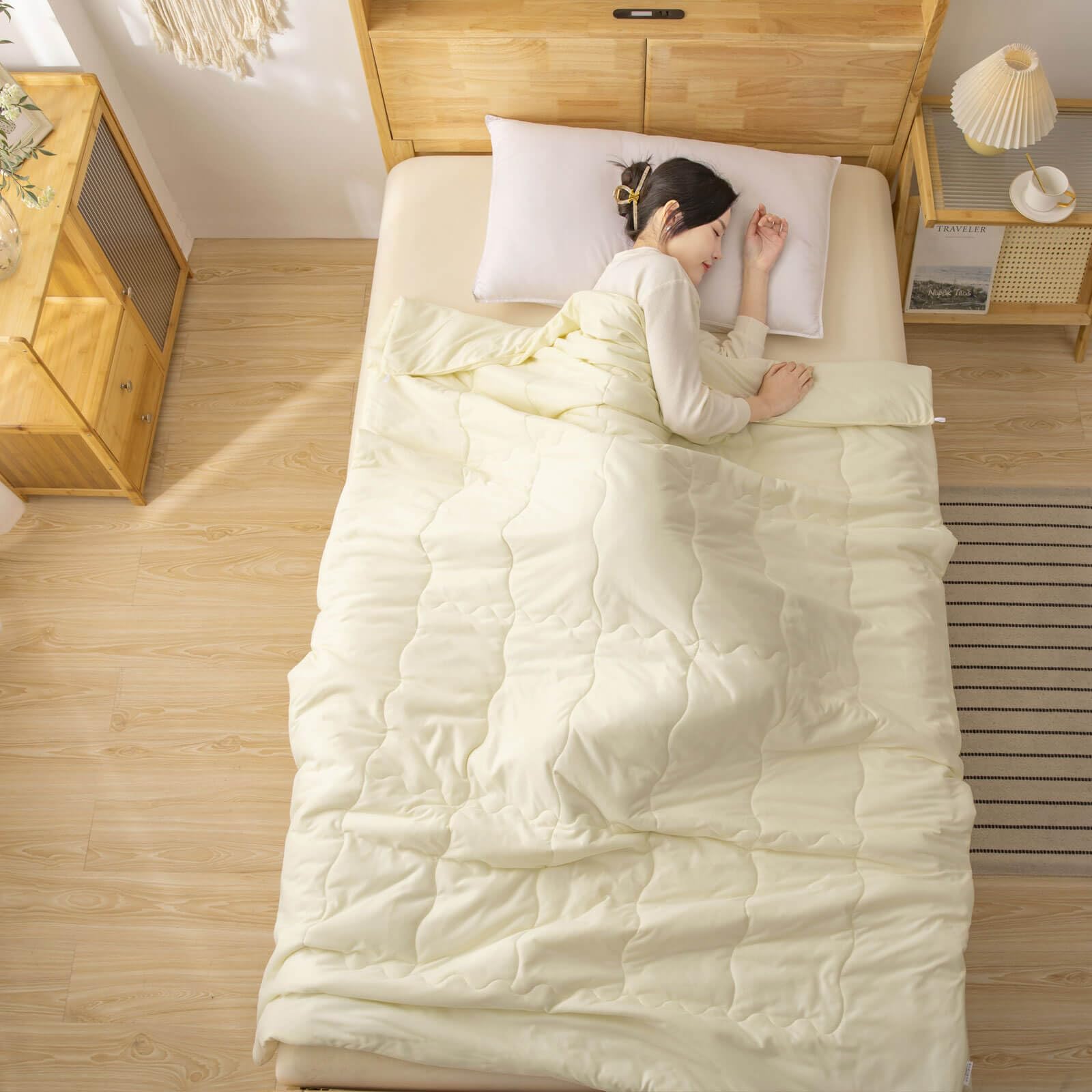 【究極の肌触り】この肌掛け布団は、ポリエステル100%の生地で作られており、肌に優しくフィットします。まるで軽い羽毛のような感触が特徴で、毎晩の睡眠を快適なものに変えてくれます。