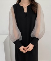 【在庫セール】[KKAERDIYA] シフォンスリーブ ワンピース 透け感 シアー スリットネック 長袖 ロング ワンピ レディース 春 夏