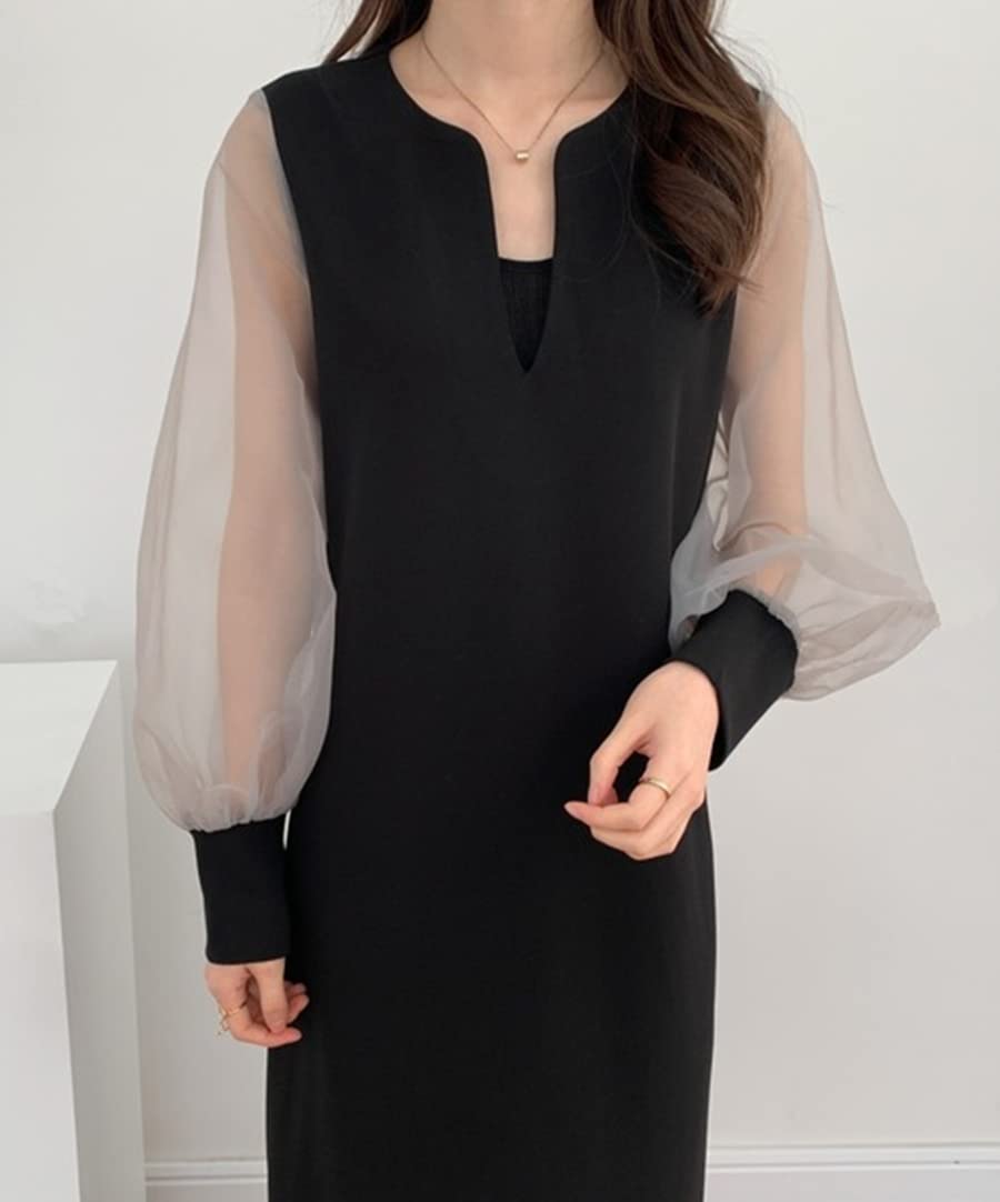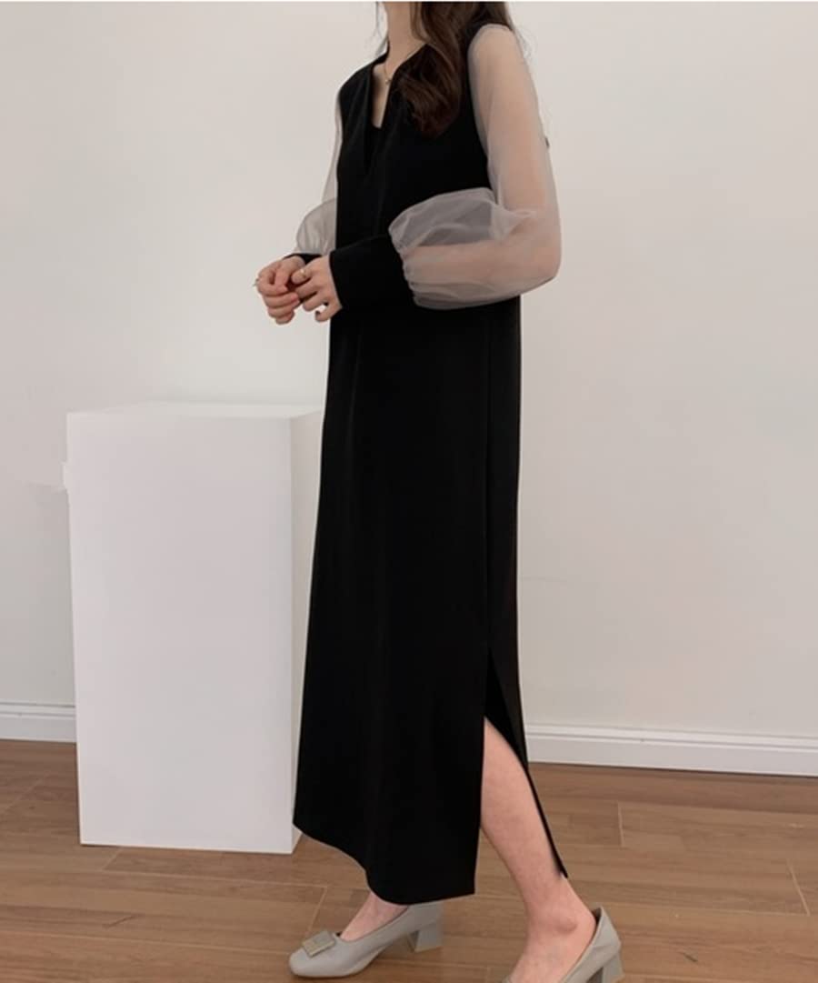 [KKAERDIYA] シフォンスリーブ ワンピース 透け感 シアー スリットネック 長袖 ロング ワンピ レディース 春 夏