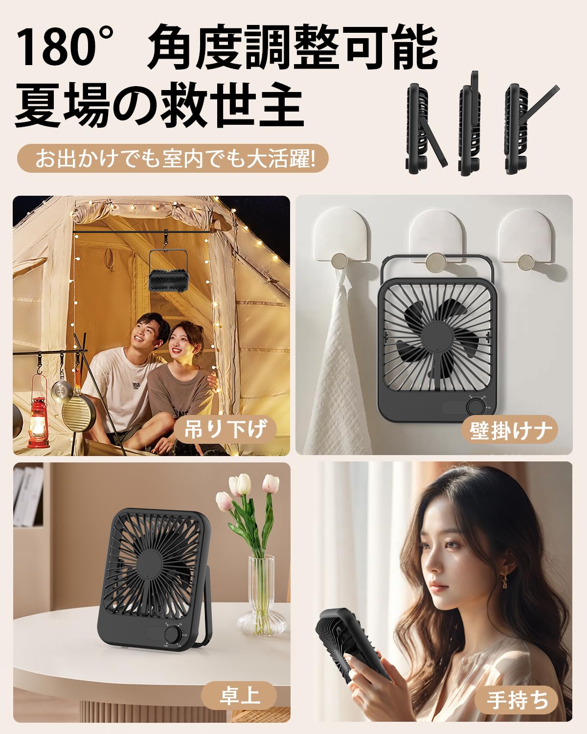 【様々シーンで活躍】真夏のフェスやアウトドア、スポーツ観戦、散歩、山登り、遠足、お祭りや日常生活でのガーデニング、お風呂上り、お化粧時、家事の時、通勤、通学、オフィスなどあらゆる場面で活躍するアイテムです。扇風機のスタンドが付いており、卓上に安定して立てます。スタンドは中空のデザインで、壁に掛けても可能です。卓上・壁掛けの両用のデザインで部屋や車内、キャンプなど、室内もアウトドアも活躍できます。