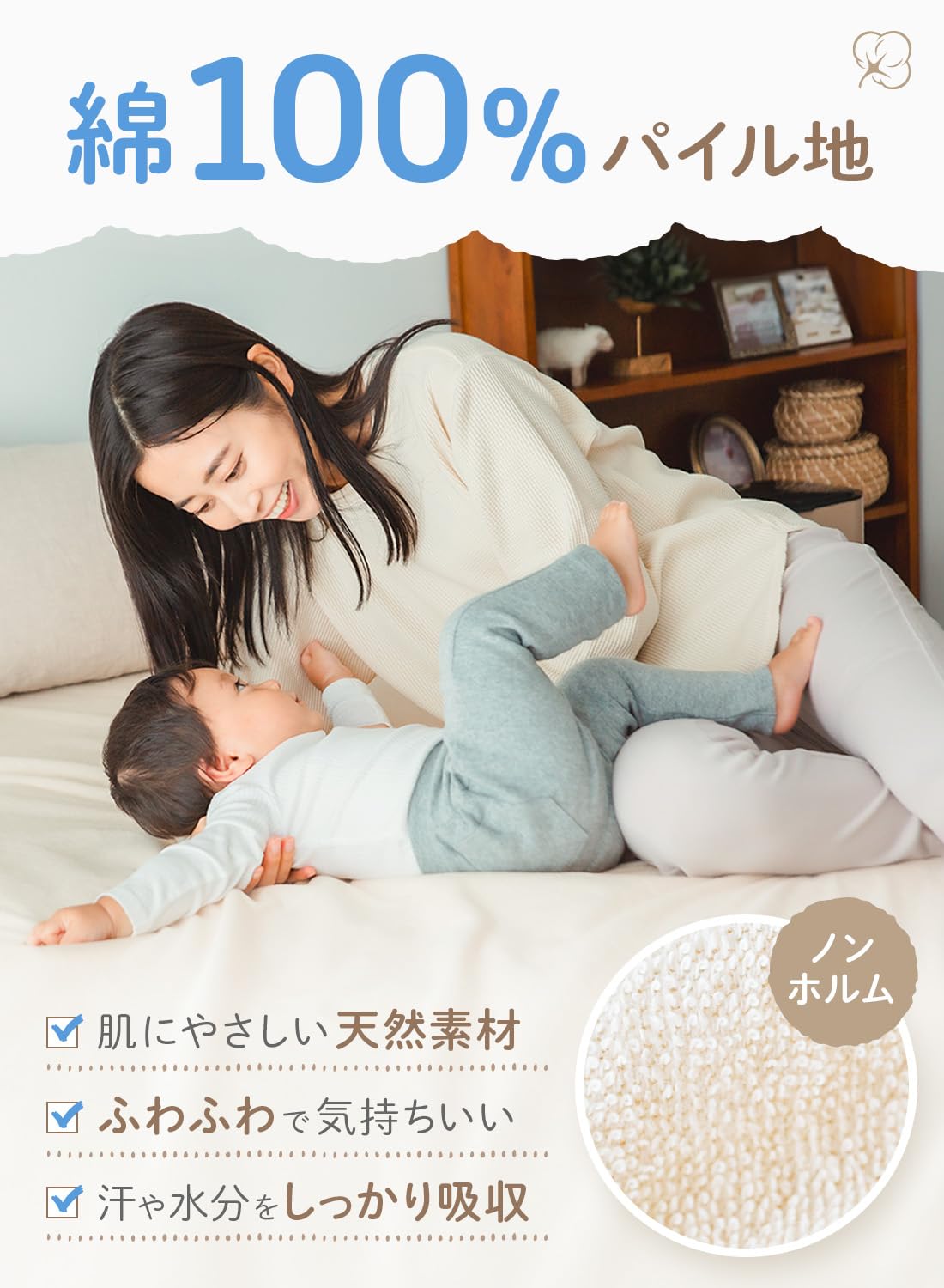 【からだに優しいダブル抗菌】お肌が触れるパイル面にはグレープフルーツから抽出した、医療・介護用にも使われる安全性の高い天然由来成分の抗菌剤を使用。防水面は抗菌剤不使用で、高密度素材により菌の繁殖を抑えて、ダニの侵入もシャットアウトします。いつでも清潔に気持ちよくお使いいただけます。