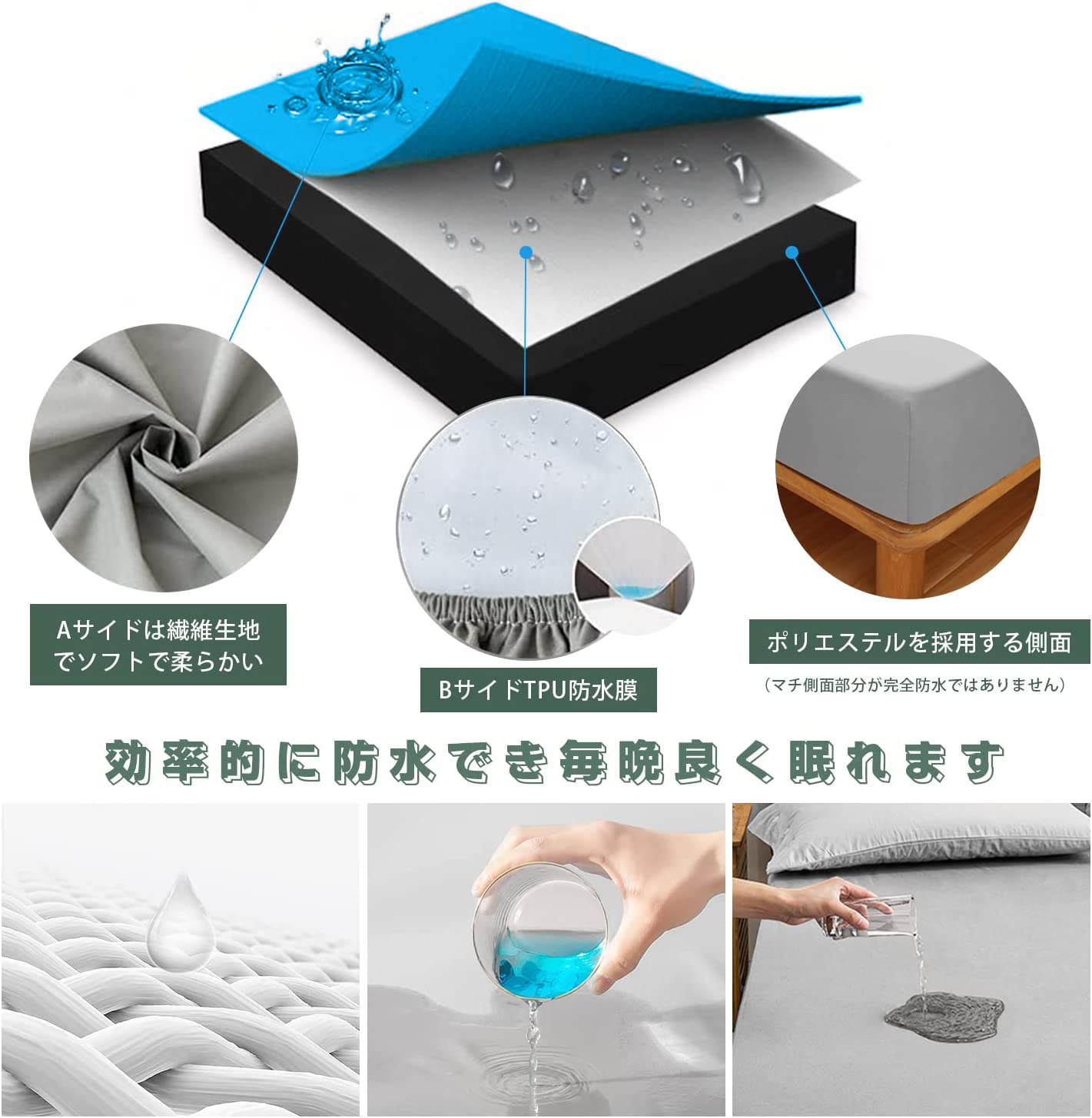 【100% 完全防水】:①防水ベッドカバーの表面:柔らかい磨き再生繊維(100%ポリエステルです)を採用、優しい肌触りで寝心地良くて快適な睡眠環境を保ってくれます。②シーツ裏面には通気性の高いTPU防水膜を採用し、防水性を高めて、汗・水などをかけでも、マットレスに水分は到達しません。側面部分も防水仕様で、横漏れした水分の染み込みを防ぎます。介護用やおねしょはもちろん、敷布団やマットレスへの浸水、汚れなどをしっかり防いでくれます。子供との添い寝やペットと一緒に寝る時に大活躍。