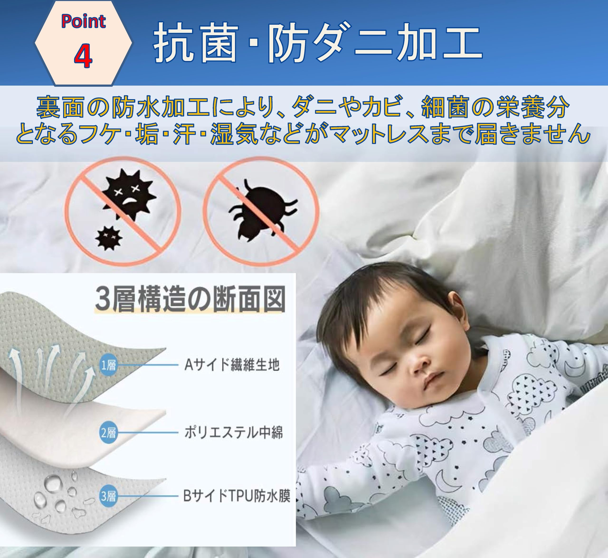 【抗菌防臭・防ダニ加工】防水シーツ 介護 敷きパッド生地にはダニを通しにくい加工を施しているので敏感なアレルギー体質の方や小さなお子様にも安心。湿気や寝汗などによる菌の増殖を抑えてそれによって引き起こされる嫌なニオイの発生も防ぎます。
