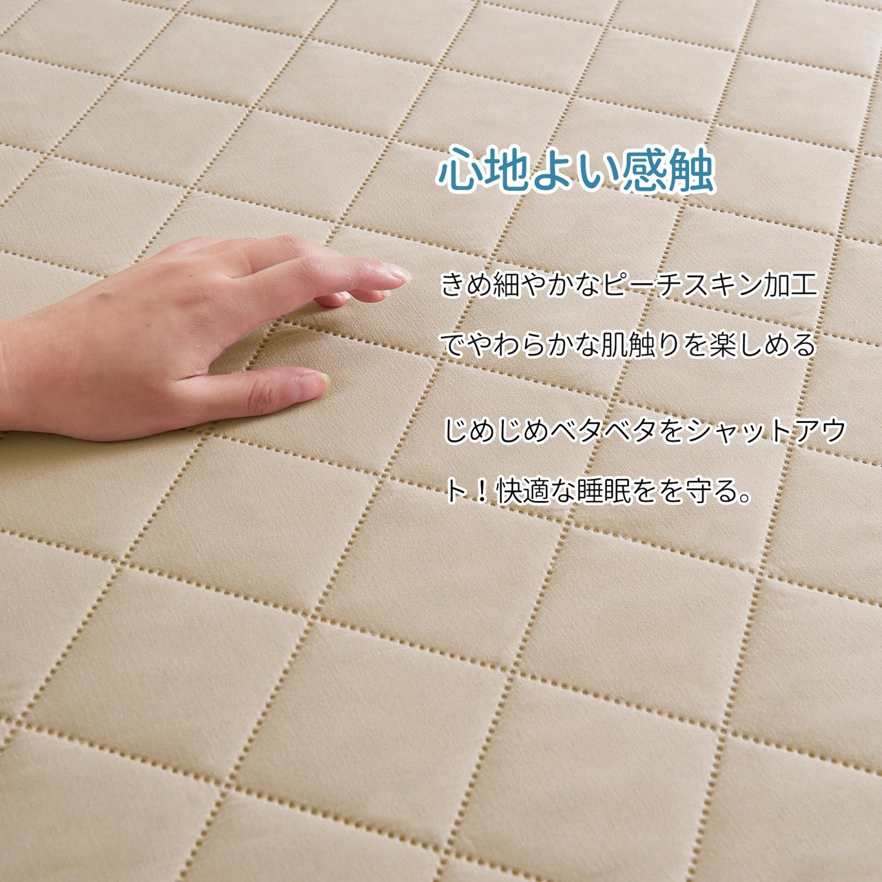 【ふんわり快適な寝心地】敷きパッドの表地はピーチスキン加工されて、中間はほどよい厚みの中綿充填、柔らかさとサポートを同時に提供します。やさしい肌触りと優れた防水性、通気性のよさを兼ね備えた肌にやさしいおねしょシーツです。パッド一体型のデザインが、一晩中ふんわりとした睡眠をサポートします。
