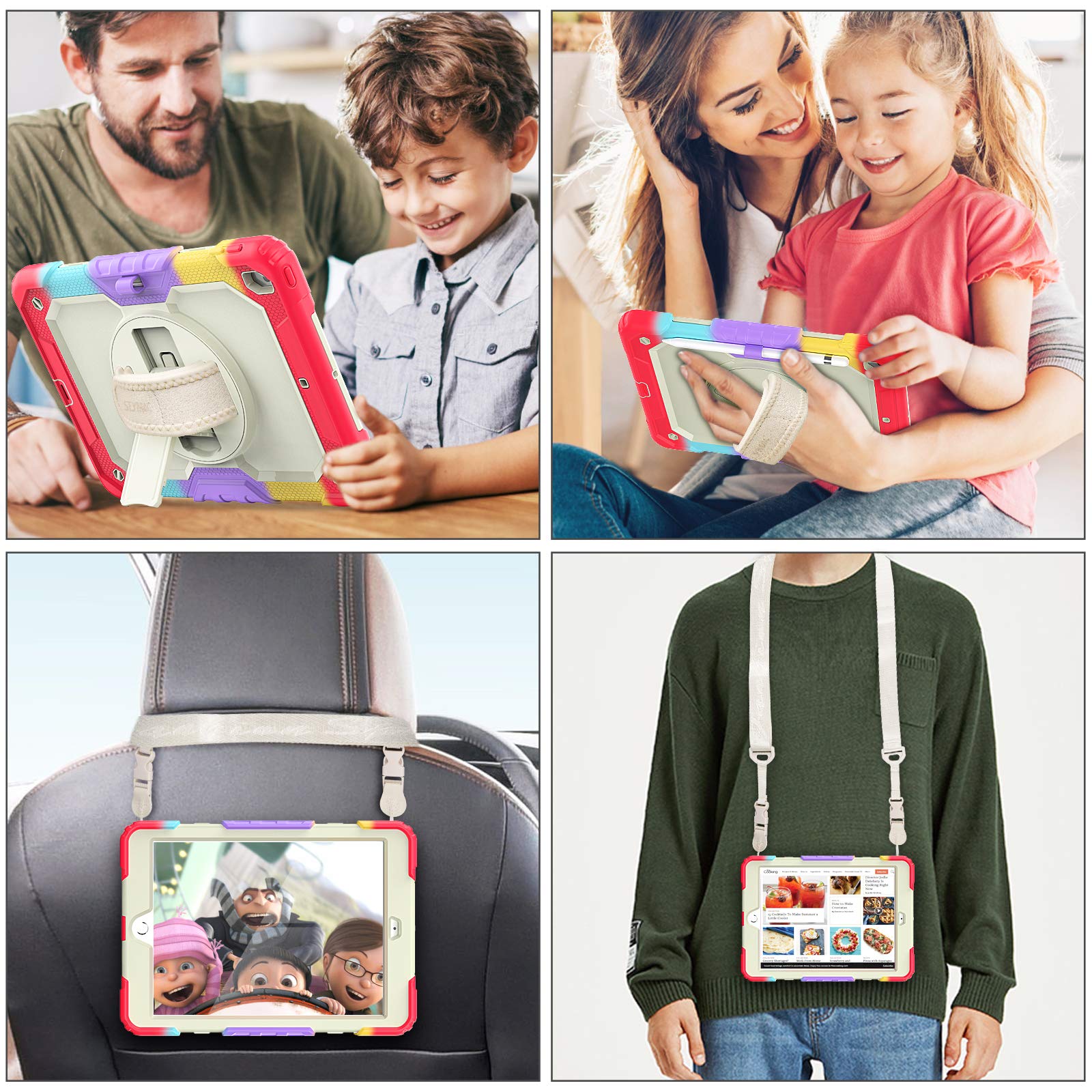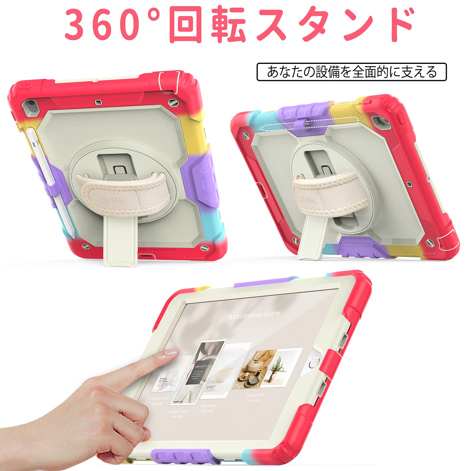 SEYMAC stock iPad 10.2インチ 第9世代/第8世代/第7世代 ケース 耐衝撃 保護フィルム付き ペン収納 360°回転スタンド ハンドストラップ ショルダーストラップ 全面保護カバー (色とりどり+レッド)