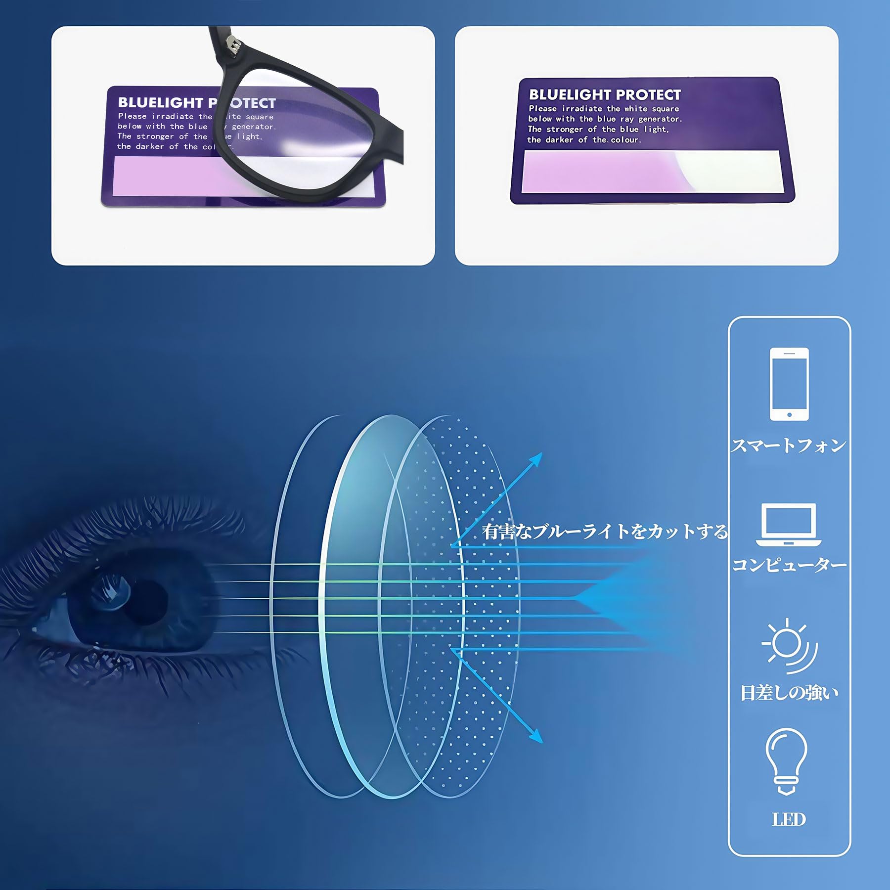 【ブルーライト対策】伊達メガネは、高品質のブルーライトカットレンズを採用しており、可視光線の透過率が高く、色収差が低いです。目に有害な光線を効果的に遮ることができ、目の疲れを軽減し、視力を保護し、睡眠の質を向上させることができます