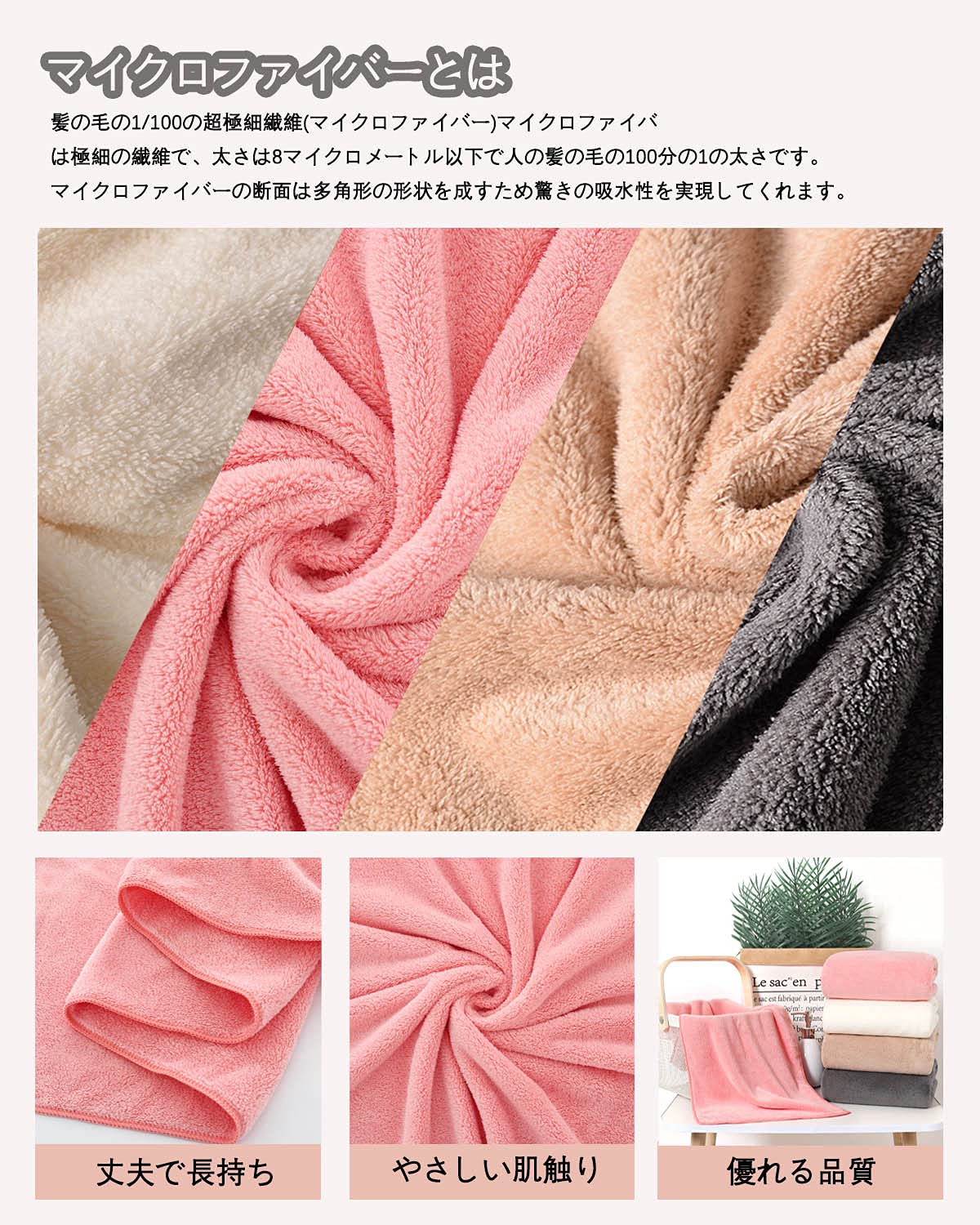 【抜群の吸水性と速乾性】綿の素材より吸水性が優れます。マイクロファイバー素材の表面は数えられない隙間があり、その隙間に大量の水分を素早い吸水できます。髪や肌にそっと当てるだけで水分が吸収される素材であり、また汚れも落としやすい特徴があります。隙間に取り込まれた空気が水分を拡散させるので、速乾性のポイントで、バスタオルの雑菌を抑え、健康を保つことができます。