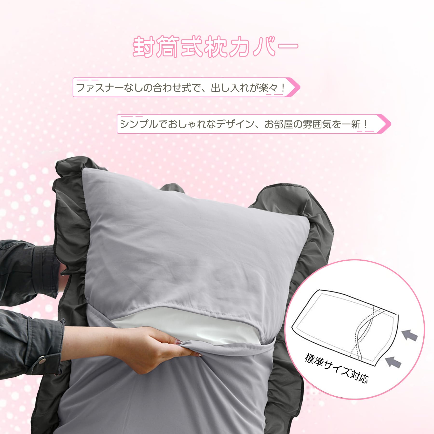 【シアサッカー生地 大人かわいい上品な フリル】 ポリエステル100%、綿素材と比べてシワになりにくく、シアサッカー生地で、肌触りが良く、快適で心地よくご利用いただけます。波のような縞ができていて柔らかな肌触りで1年中でご愛用いただけます。おしゃれで甘すぎない程よいフリル感に仕上げました。いつもの寝具にセットするだけで、お部屋を華やかに演出します。