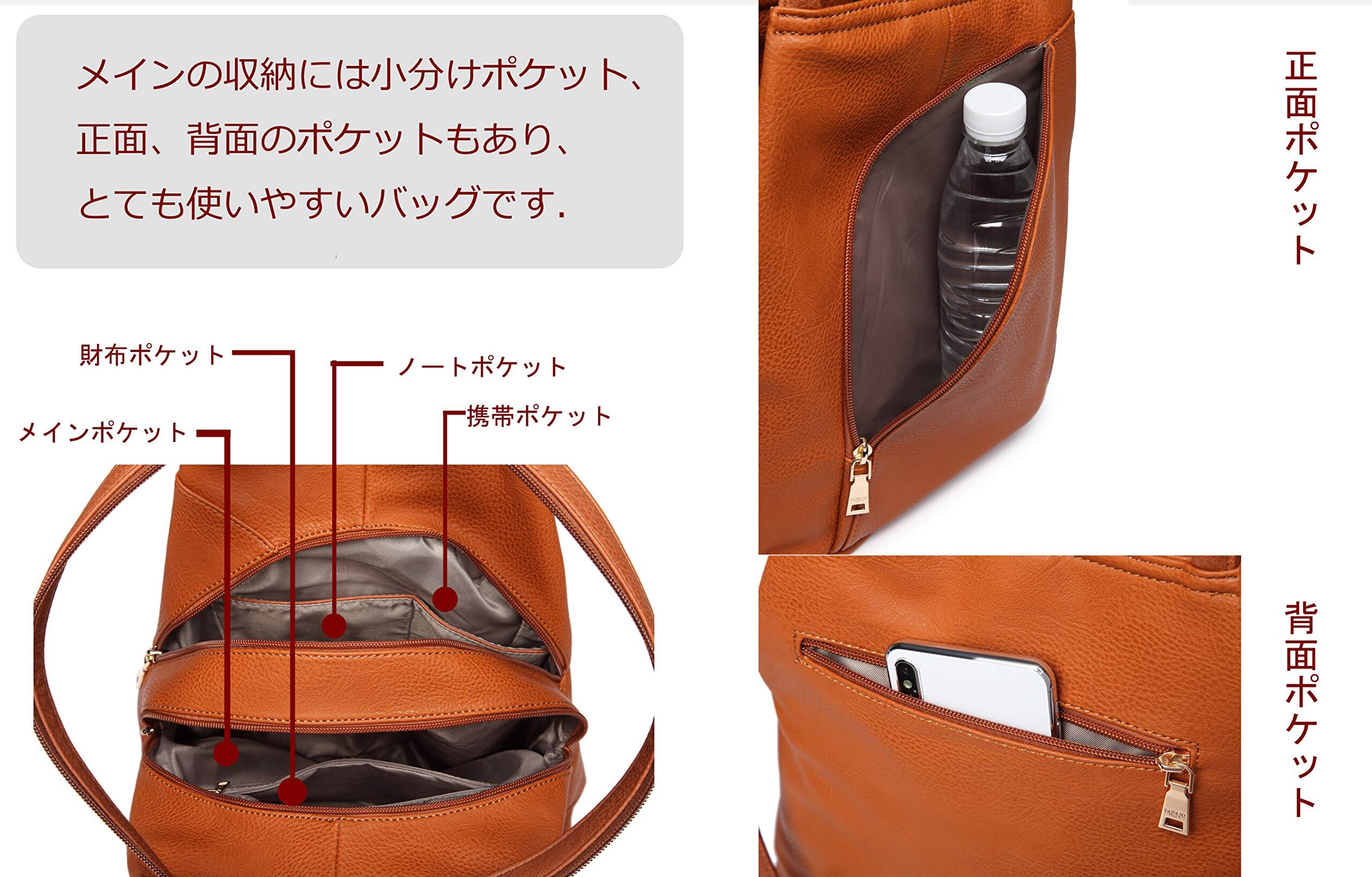 【開閉部】ファスナー×2 【外側ポケット】背面ファスナーポケット×1、前面ファスナーポケット×1、【内側ポケット】オープンポケット×3、ファスナーポケット×1 【素材】PUレザー