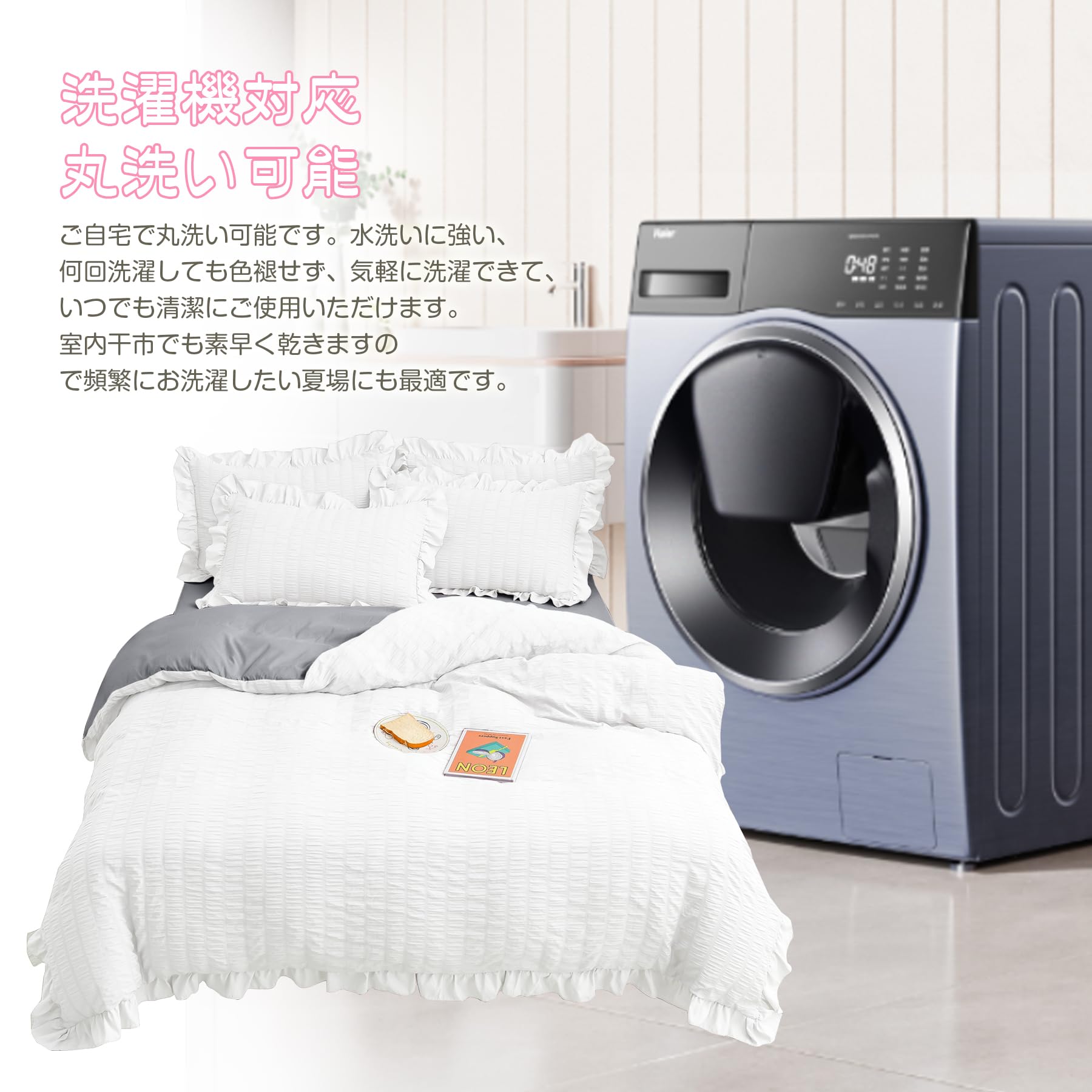 布団カバー AYO シングル・3点セット シアサッカー生地 フリル付き 掛け布団カバー ベッドカバー 枕カバー ボックスシーツ 寝具カバーセット ピーチスキン加工 洋式和式兼用 洗い替え 速乾タイプ(ホワイト+グレーシングル・3点セット)