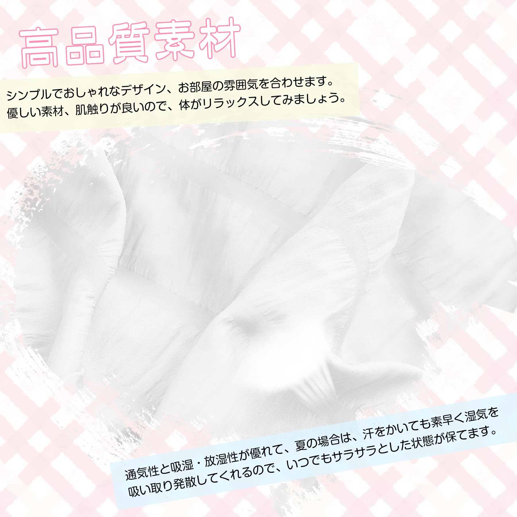 【シアサッカー生地 大人かわいい上品な フリル】 ポリエステル100%、綿素材と比べてシワになりにくく、シアサッカー生地で、肌触りが良く、快適で心地よくご利用いただけます。波のような縞ができていて柔らかな肌触りで1年中でご愛用いただけます。おしゃれで甘すぎない程よいフリル感に仕上げました。いつもの寝具にセットするだけで、お部屋を華やかに演出します。