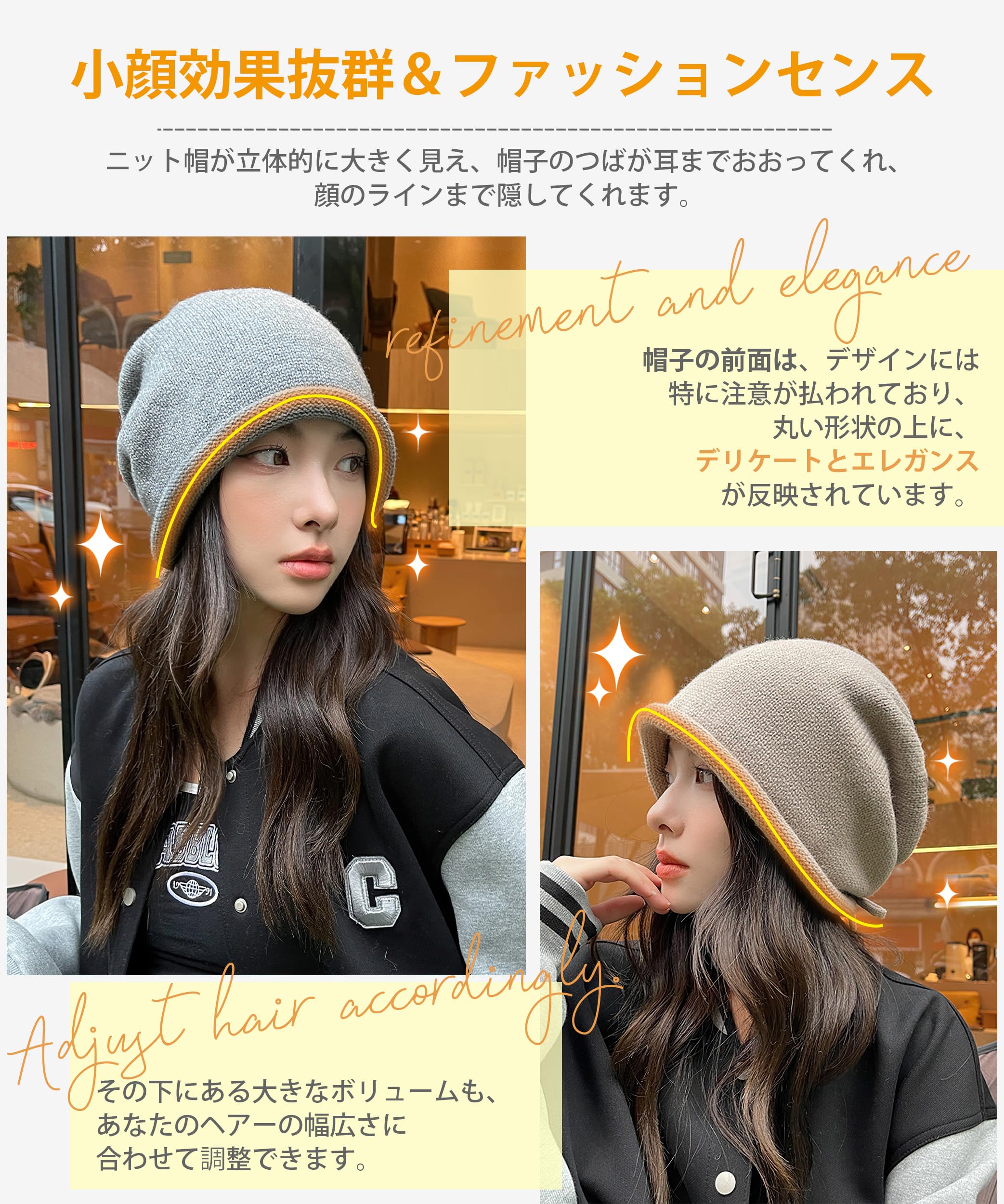 【可愛い小顔に見える】ニット帽が立体的に大きく見え、帽子のつばが耳までおおってくれ、顔のラインまで隠してくれるので、小顔効果抜群です!ニット帽のかぶり口がくるんとなっているので、顔を小さく見せるだけでなく、髪に跡もつきにくくて大変便利です。伸縮性のあるゆったりとしたレディースニット帽子で、頭周りが大きくてもかぶりやすい