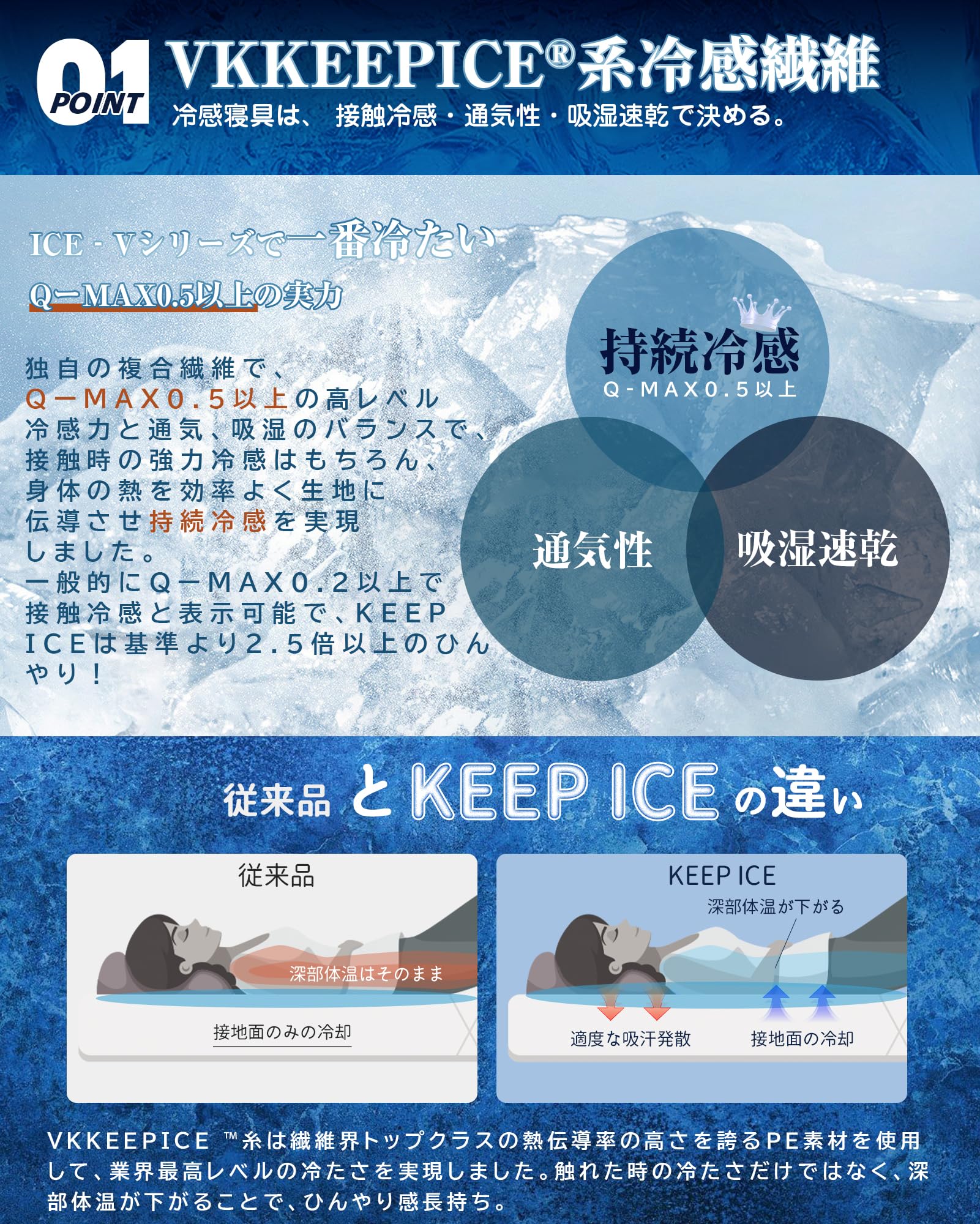 【VKKEEPICE 糸冷感繊維】VKKEEPICE 糸は繊維界トップクラスの熱伝導率の高さを誇るPE素材を使用して、業界最高レベルの冷たさを実現しました。触れた時の冷たさだけではなく、深部体温が下がることで、ずっと『ちょうどいい』冷たさをキープ、朝までひんやり持続。暑がりさんも朝までぐっすり。