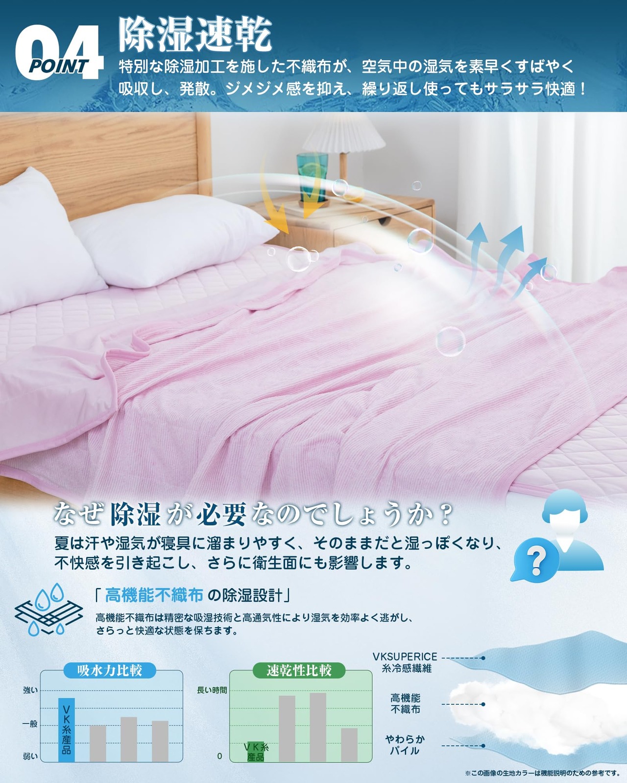 【除湿速乾】夏の寝苦しさは、温度だけでなく、湿気も夏の寝苦しさの要因となる。特別な除湿加工を施した不織布が、空気中の湿気を素早く吸収し、発散する。湿度を50±5%に近づけることでじめじめ感を解消、繰り返し使ってもサラサラ快適!