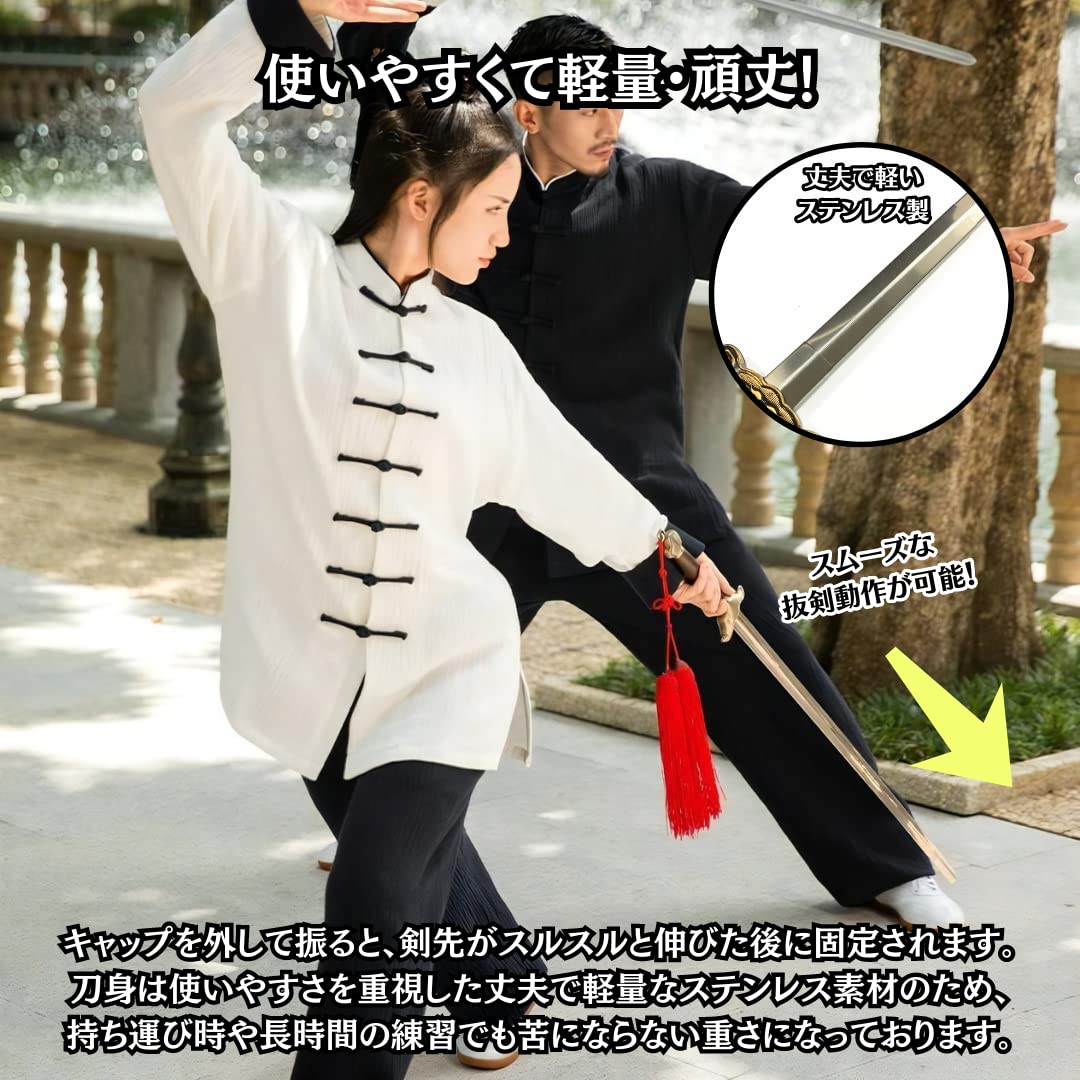 【使いやすくて軽量】キャップを外して振ると剣先がスルスルと伸びてくる仕様のため、スムーズでスタイリッシュな抜剣動作が可能です。材質は使いやすさを重視した丈夫で軽量なステンレス製のため、持ち運び時や長時間の練習でも苦にならない重さになっております。色鮮やかな剣穂も付属しておりますので、演武や舞台などでは動作やポーズがとても良く映えます!