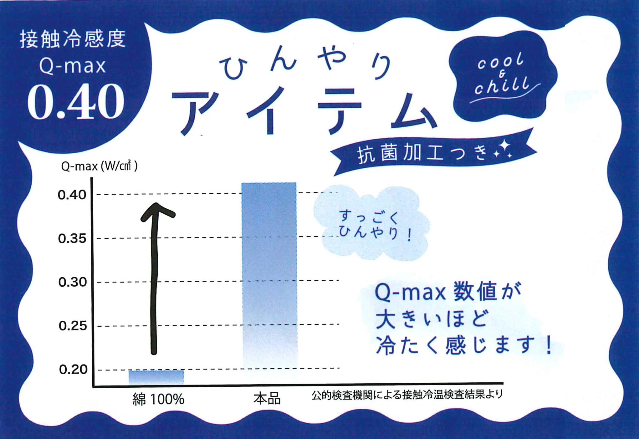 接触冷感素材のひんやり枕カバー。接触冷感度を表すQ-max値が、綿100%が0.20に対し本品は0.40で2倍相当のひんやり具合。抗菌加工で枕に取り付けやすいゴムバンド付きです。
