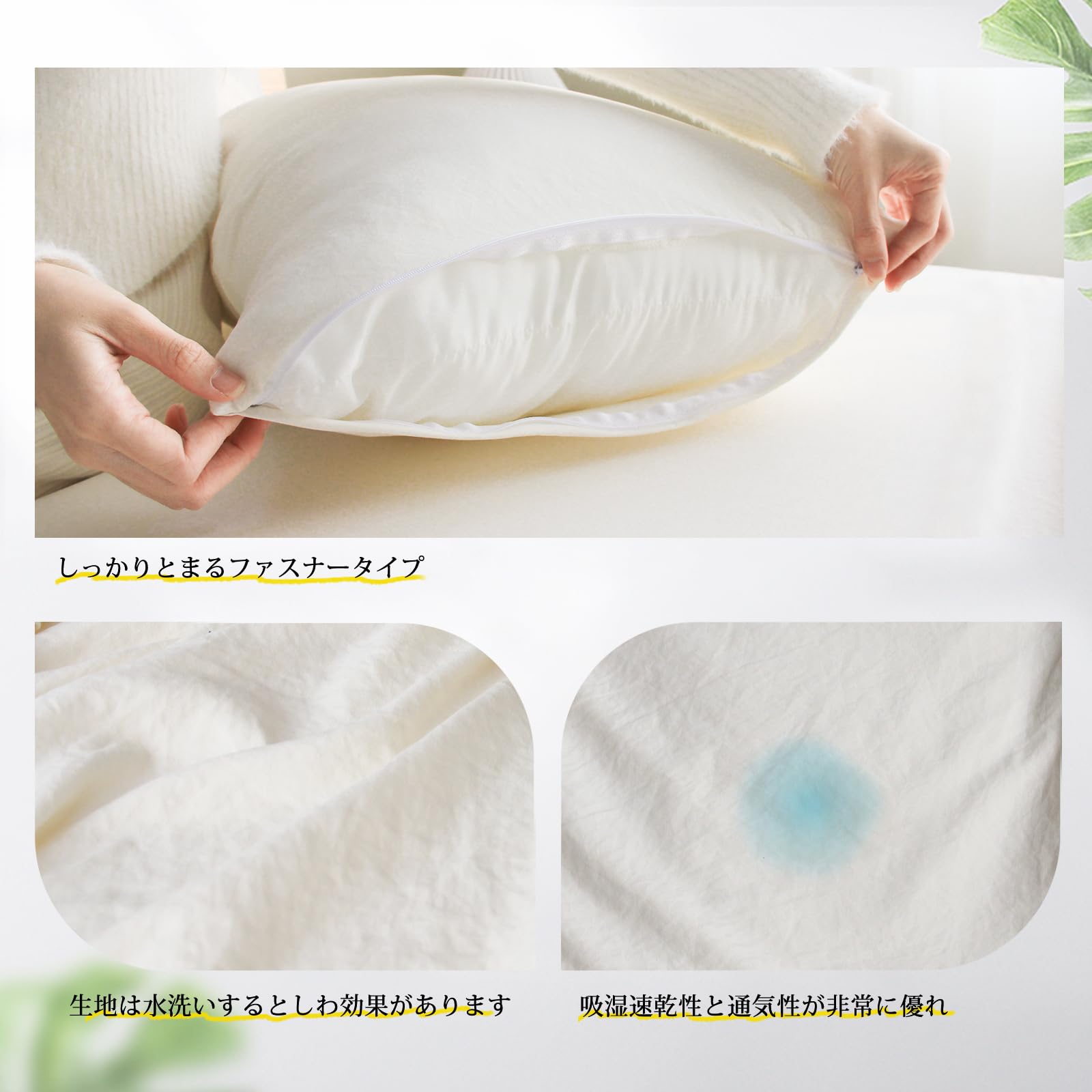【オールシーズン向け】暑い季節は汗を吸いやすく、寒い季節は保温性に優れています。また通気性もよい、汗をかいても素早く湿気を吸い取り、発散してくれるので、いつでもサラサラとしています。この枕カバーは一年を通じてお使いいただけます。