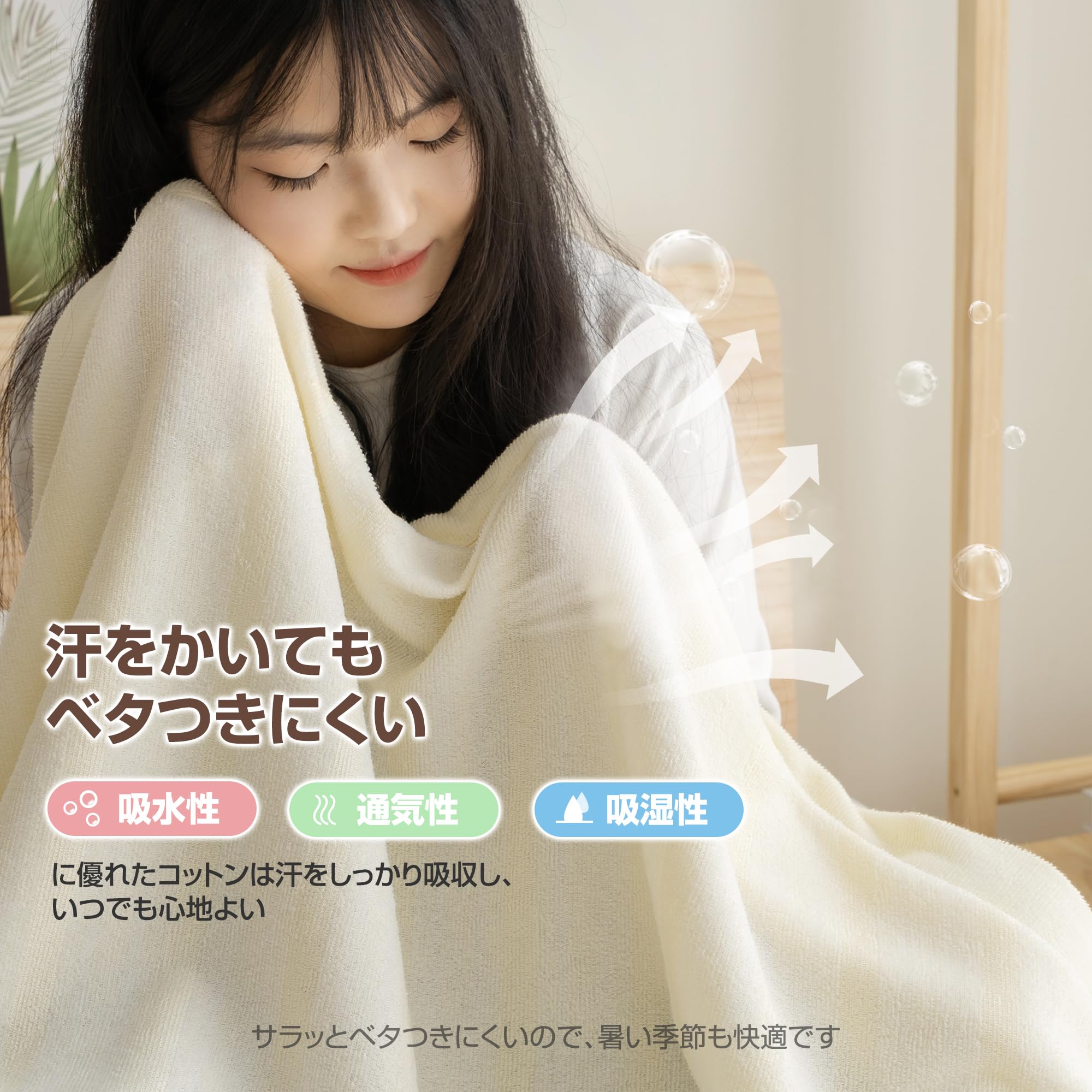 【吸湿・速乾・通気】吸水性·通気性·吸湿性に優れた綿素材は汗をしっかり吸収し、いつでも心地よい。サラッとしてベタつきにくいので、寝起きもすっきり爽快です。やわらかで軽やかな気持ちよさが続くタオルケットは、暑い季節も快適にお使いいただけます。