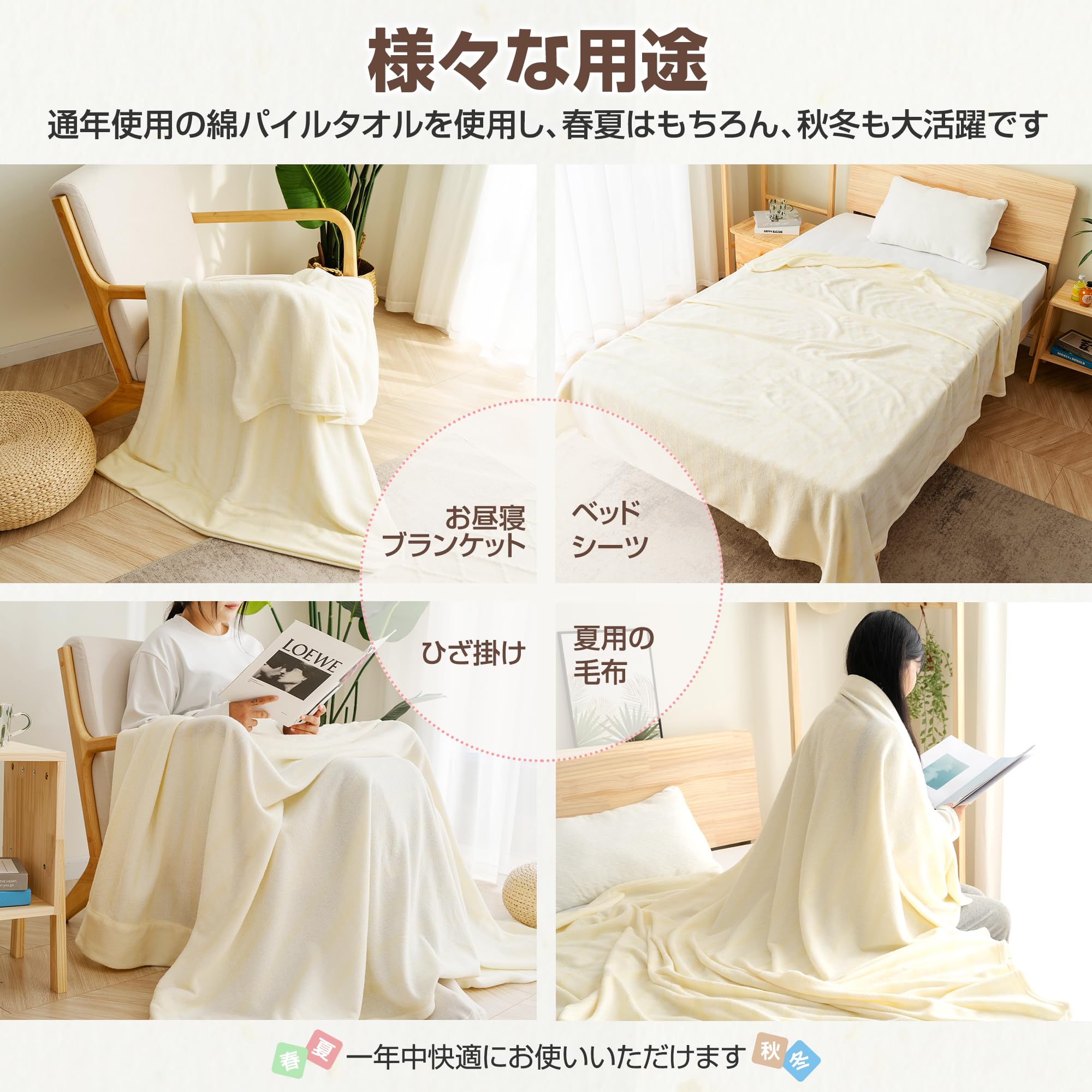 【オールシーズン使える】1年中活躍してくれるタオルケット。通年使用の綿パイルタオルを使用し、春夏はもちろん、秋冬も大活躍です。軽くてふわっとした掛け心地の軽量タイプので、押入れにもすっきり収納できます。1枚で使うだけではなく、他の寝具と組み合わせることでも効果を発揮します。