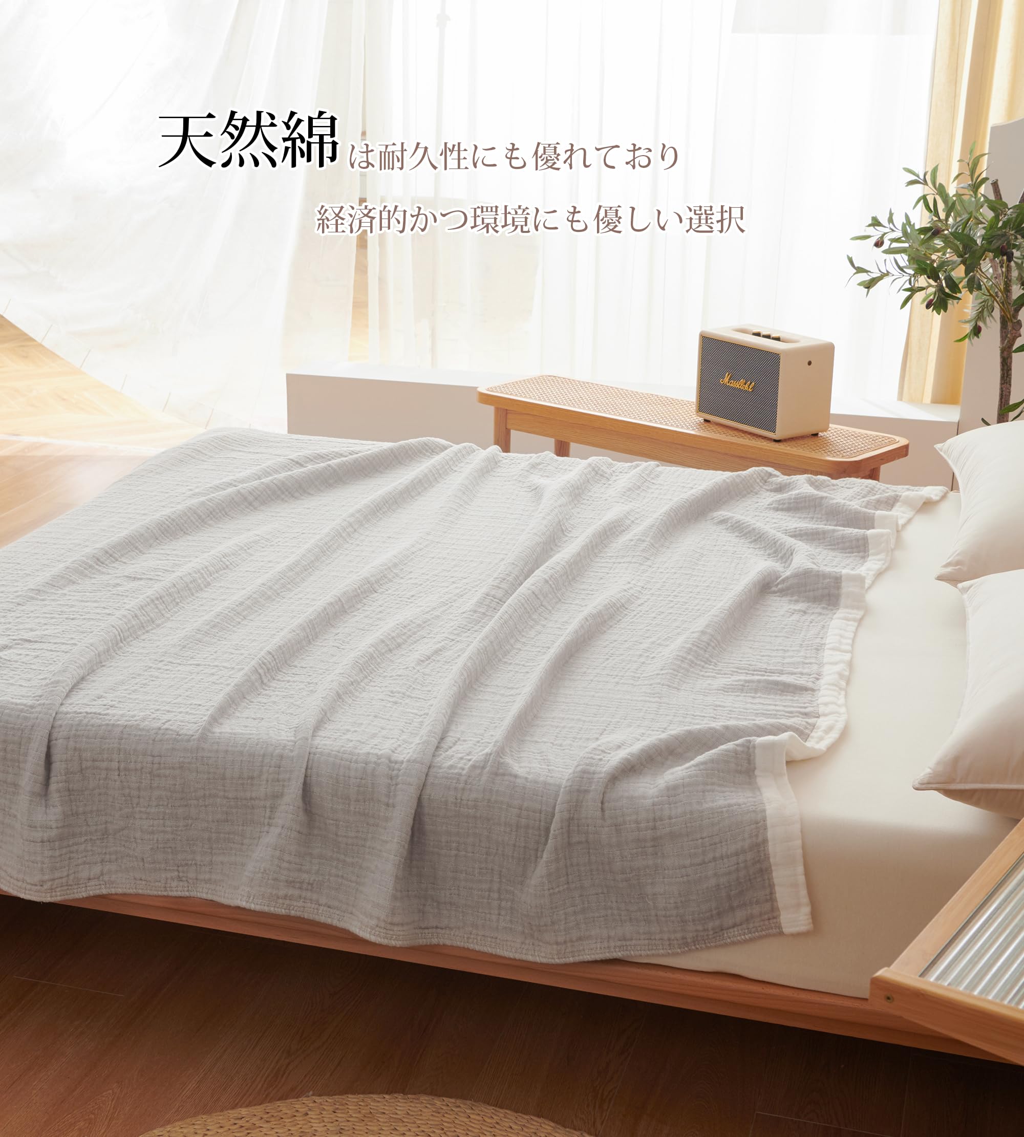【お肌に優しい天然コットン】エジプト産の超長綿を使用し、化学物質を一切添加せずに作られたガーゼケットは、究極の心地よさと安心をお届けします。天然綿は繊維が細かく柔らかいため、肌に触れると心地よい感触が広がります。また、化学物質を添加していないで作られているため、ふんわりやわらか、肌かけ・肌触りもやさしく、軽い掛け心地になり、デリケートな肌の人にもお使いいただけます。さらに、天然綿は耐久性にも優れており、長期間ご愛用いただけることです。
