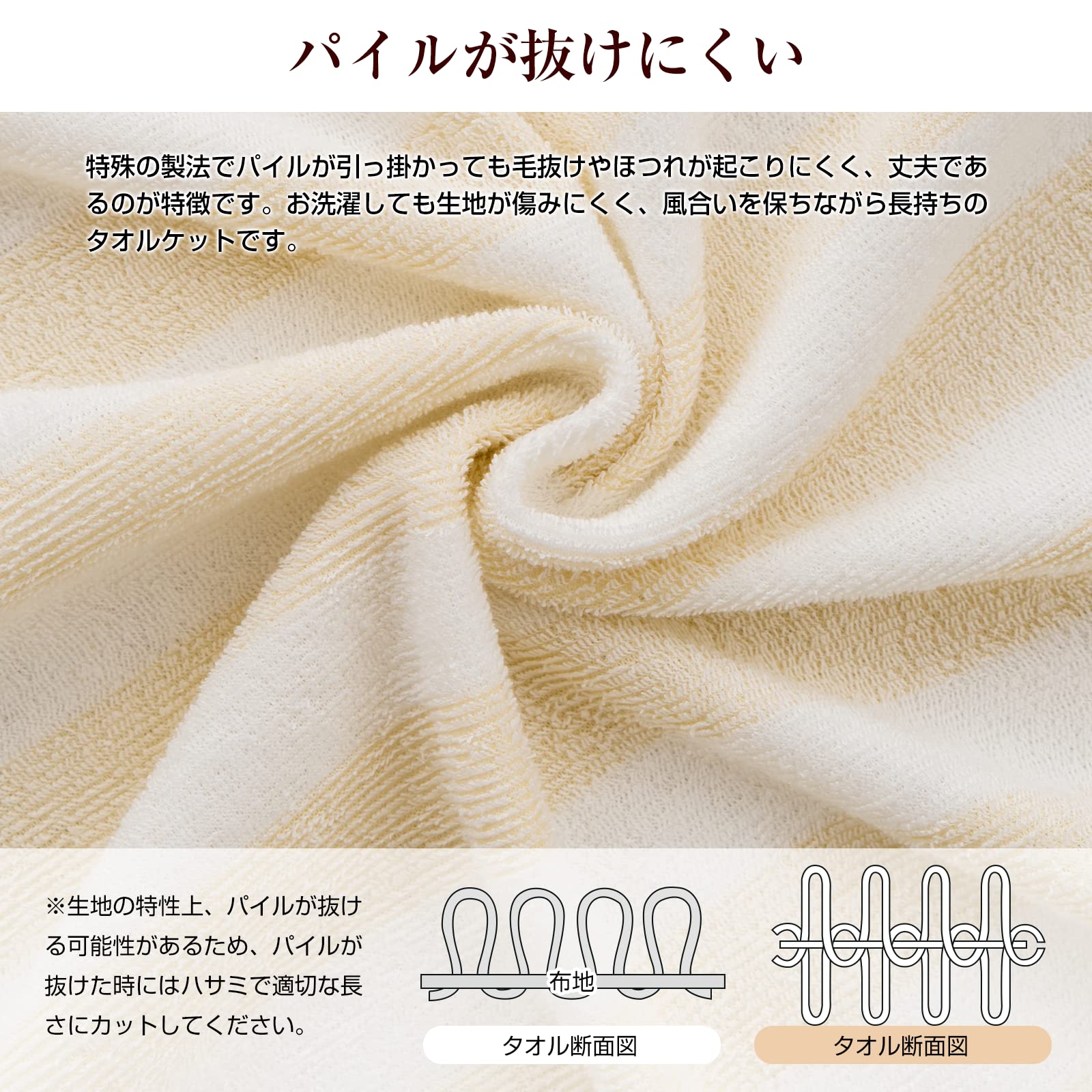 【パイルが抜けにくい】 パイルの抜けを防ぐため、本製品は適度な長さのパイルを採用しています。毛羽落ちを抑えて糸の劣化を防ぐために、マイヤー織りの製法を使用します。マイヤー織りとは、パイル糸を縦横の基布に絡ませて織り上げる製法です。パイルが抜けにくく、長く使うことができます。また、通常のタオルと比較するとポリエステル地糸の密度がつまっているため、パイルが抜けにくい構造になっております。 ※生地特性の上で、パイルが抜ける可能性があるため、パイルが抜けた際にはハサミで適切な長さにカットしてください。