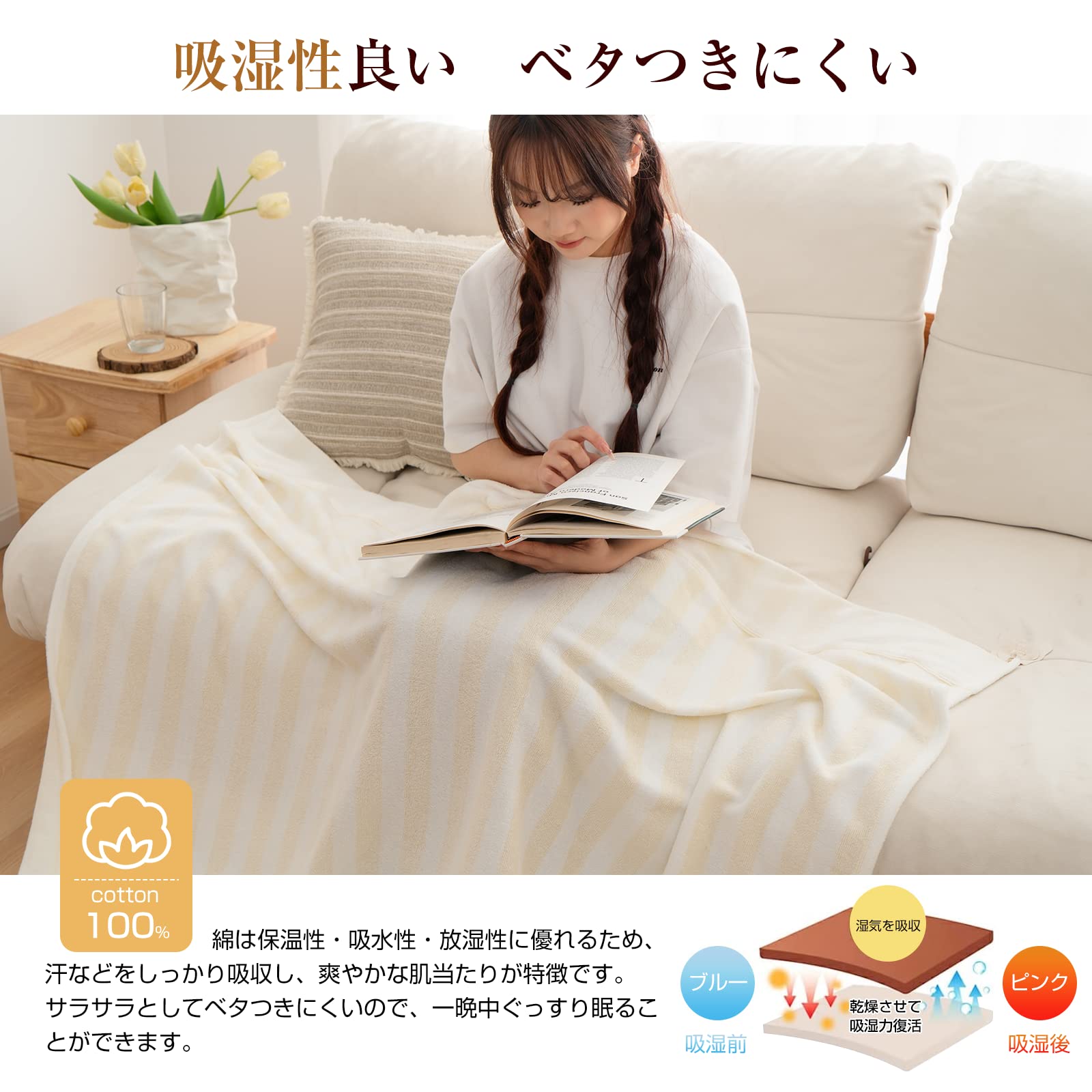 【オールシーズン・様々な用途】肌掛けのコットン素材なので、一年中お使いいただけます。汗ばむ季節は吸水性があるのでサラッと快適で、冷房の効いた部屋での毛布としてもお使いいただけます。肌寒い季節はパイルが程よく空気を含んであたたかく、毛布の代わりに布団のインナーとしても使えます。また、シーツとしても適しています。 ホームだけでなく、温泉・旅行・お花見などいろいろなシーンで大活躍します。自分が使うだけではなく、同僚、上司、お客様へのお礼、友達祝い、親孝行、祝日のギフトにもおすすめです。