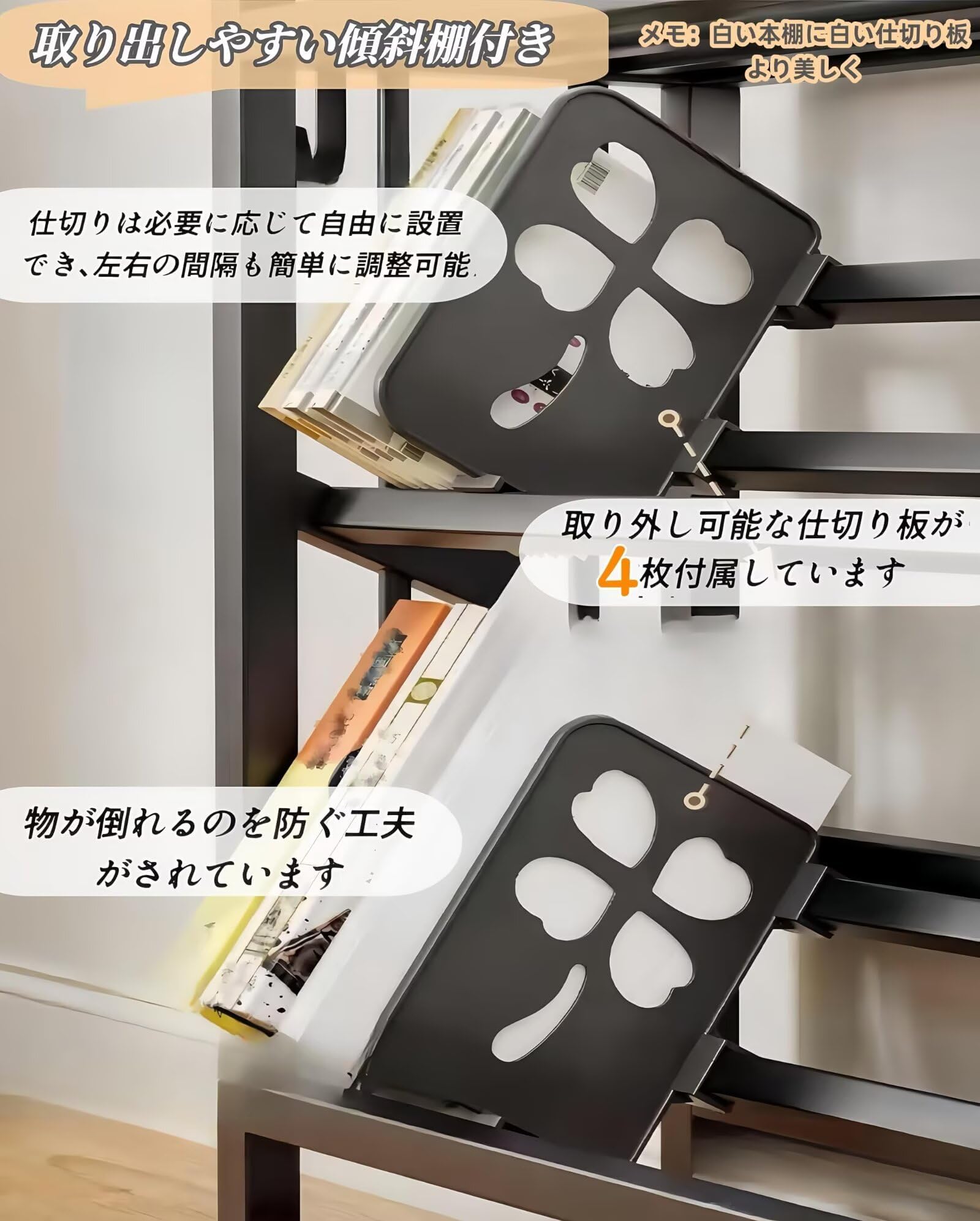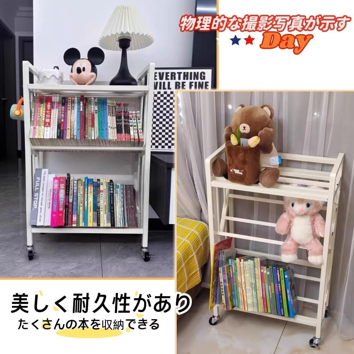 【耐荷重&フック付き】本棚はスチール素材を採用しており、各段の耐荷重が約25kg あるため、重たい物もしっかり収納できます。耐荷重が良く、変形しにくく、頑丈で耐久性があります。取り外し可能のフック付き、サイドにヘッドホンやバッグなどを掛けることができます。シンプルなデザインで置く場所を選びません。