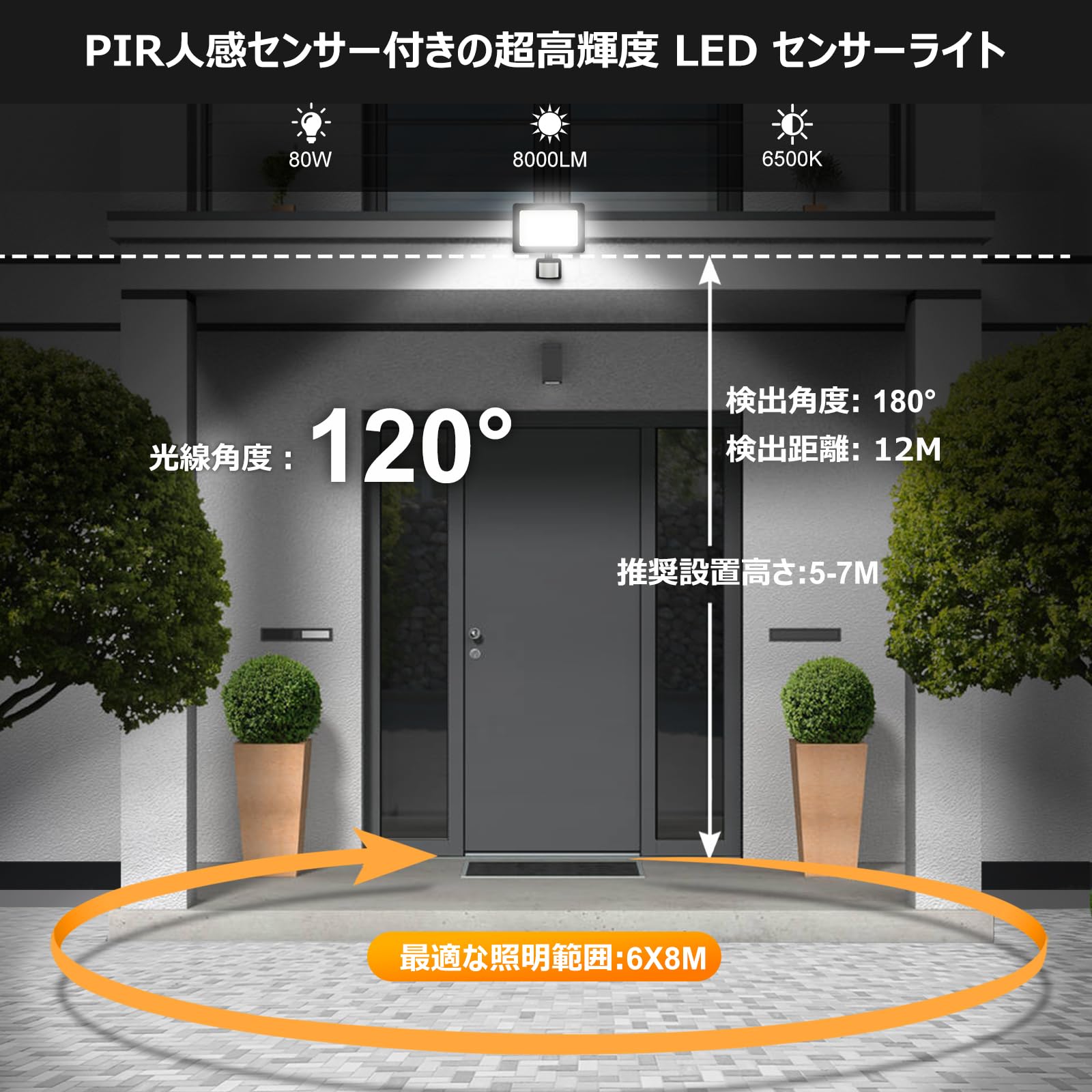 【主な仕様】:消費電力:80w;「リモコン操作または手動で操作可能」LED発光源:SMD ;昼白光;色温&ルーメン:6500K 8000LM;ケーブル:1.5m;入力電圧:AC 90-120V 50/60Hz;反射板:強化ガラス;「常時点灯機能付き」「調光機能」「検出距離調整可能」「記憶機能」「led設計寿命: 50000時間以上」「発光角度:120°」「検知範囲:180°」「防水レベルー:IP66」「2年間の保証」