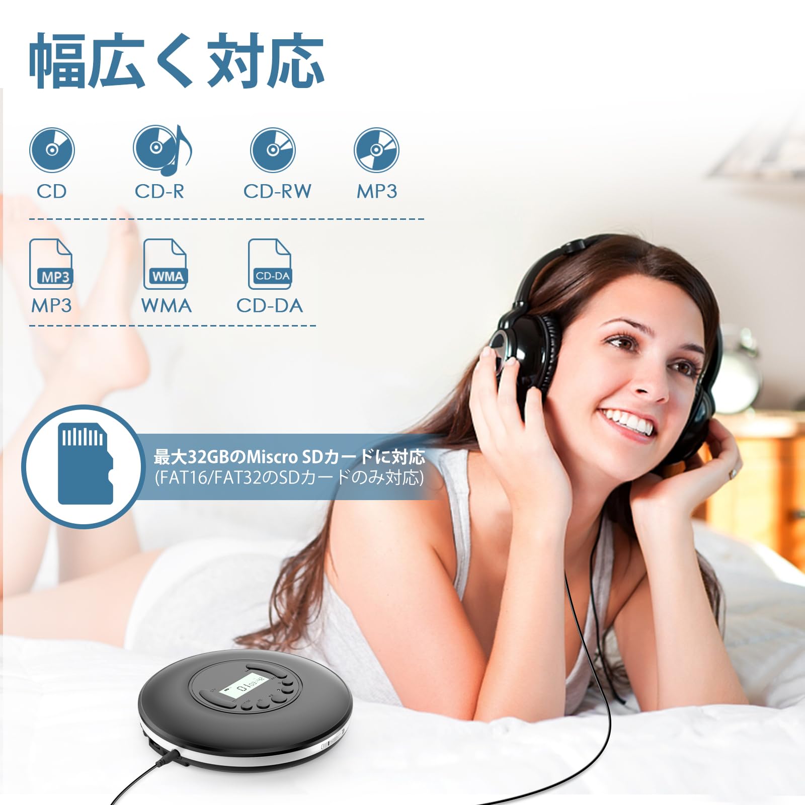 【Micro SDカードに対応するミニCDプレイヤー】本製品は最大32GBのSDカードに対応しますので、スマホやパソコンでダウンロードする音楽も楽しめます。(ご注意:FAT16/FAT32のSDカードしか対応できません。NTFSのSDカードに対応しません)。また、手のひらサイズと約206gの重さで便利に持ち歩くことができます