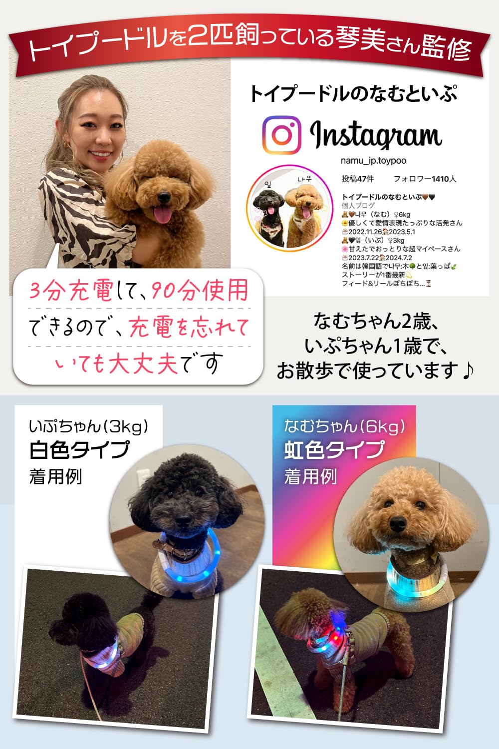 【トイプーのなむちゃん愛用!】光る首輪 LED 【3分充電で90分使用可能】(小型犬専用xサイズ調整可能)フル充電30分で4時間使用可能 (ホワイト S:35㎝)