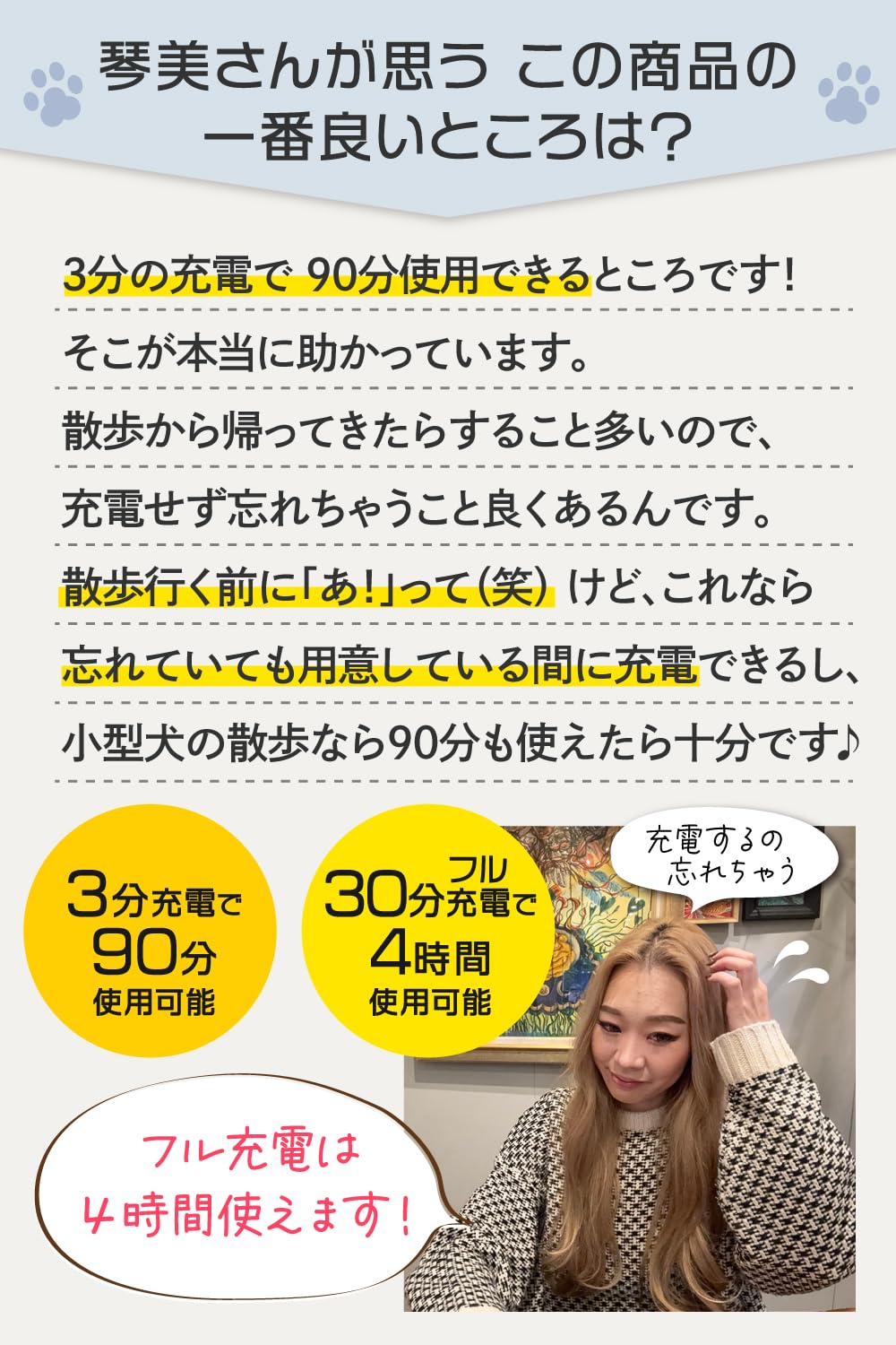 3分充電で90分使用可能なので、充電を忘れていても安心です