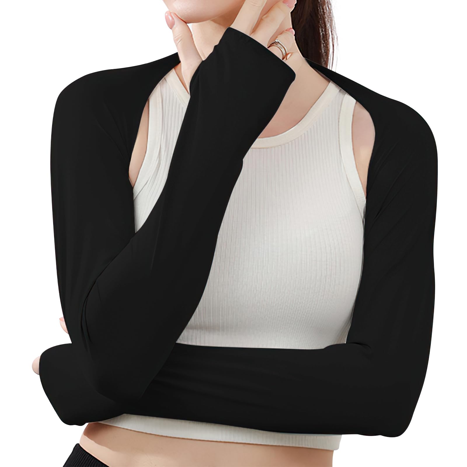 【超広カバー範囲で徹底UV対策!】ボレロ型アームカバーが手首~肩までをしっかりカバーし、さらには手の甲、背中のデコルテもガードします。超広カバー範囲を実現するレディースアームカバー。長時間の外出でも安心してご利用いただけます!蚊等の虫刺され予防にも、オフィスの冷房対策にも!