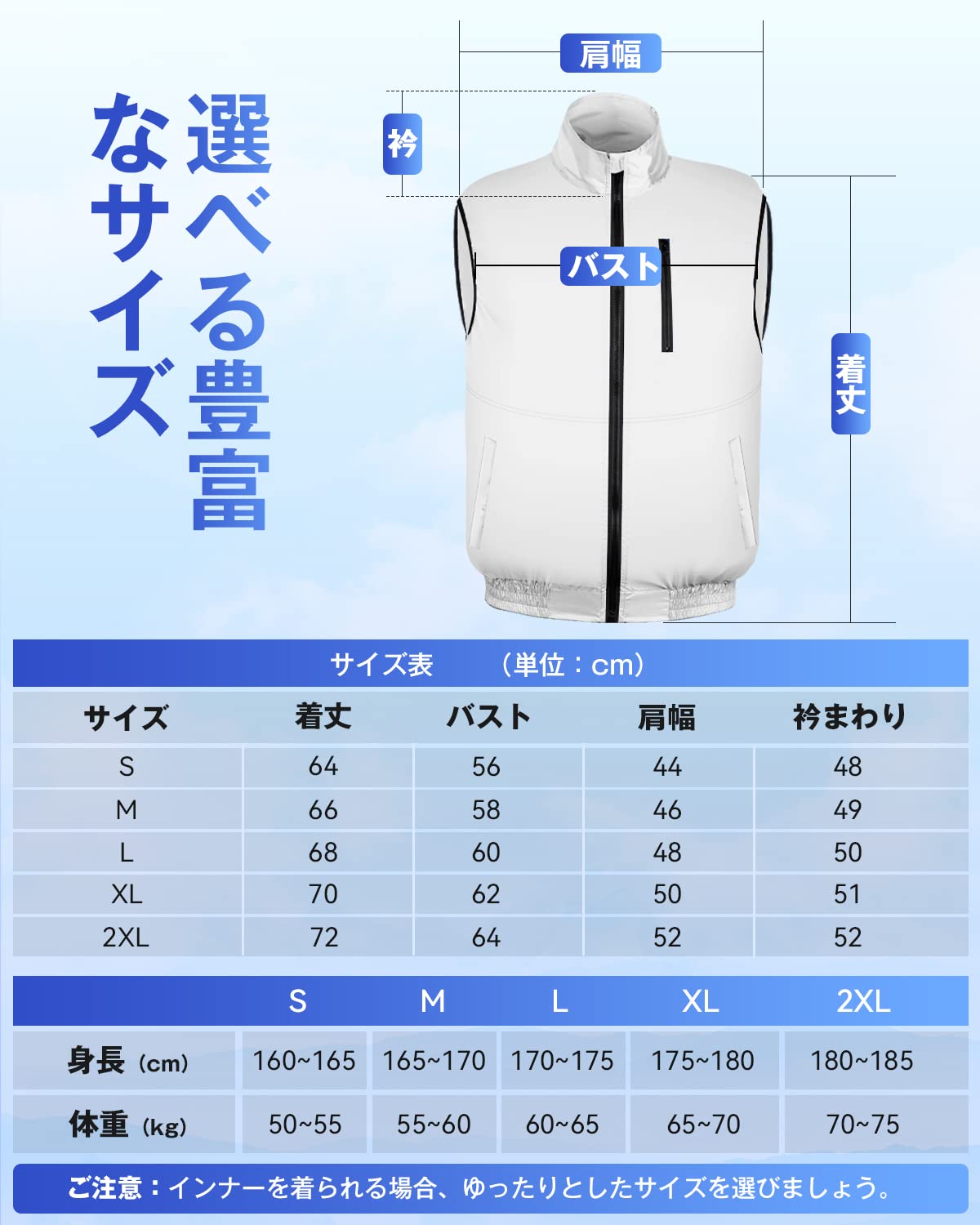【4段階風量調節】空冷服は簡単に取り付けられます。空気を循環させることにより、体感温度を下げます。4段階風量調節可能、需要に応じて風量を切り替えられます。通勤、通学、ガーデニング、現場仕事、配達作業、ハイキング、釣りなど様々なシーンで活躍できます。