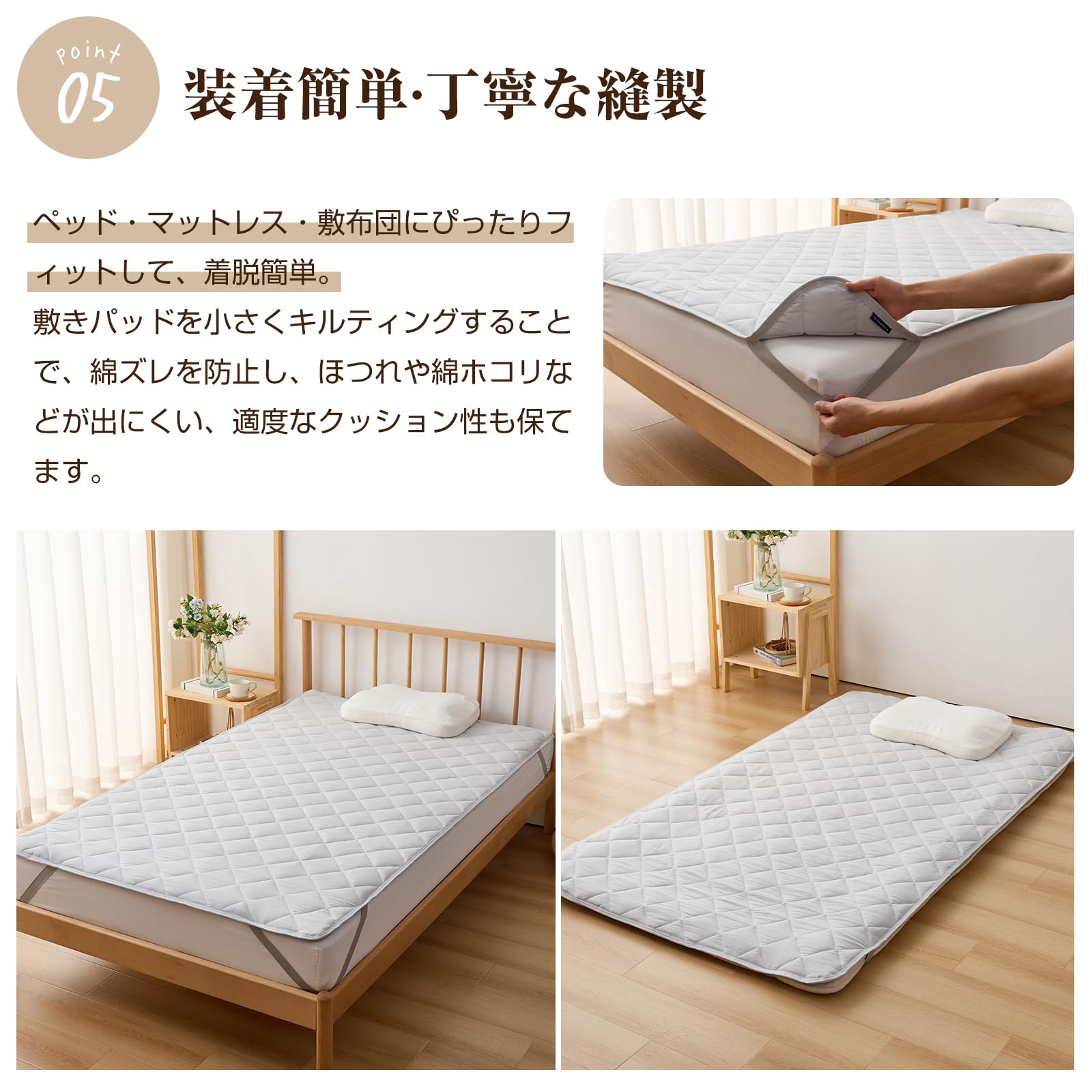 【丁寧な縫製・丸洗いOK】敷きパッドを小さくキルティングすることで、綿ズレを防止し、ほつれや綿ホコリなどが出にくい、適度なクッション性も保てます。生地、中わたともに洗いに強く、乾きの早い素材ですので、ご家庭の洗濯機で手軽に丸洗いが出来ます。何度洗濯しても保温効果が持続しますのでご安心ください。※洗濯する場合は洗濯ネットに入れて洗ってください。