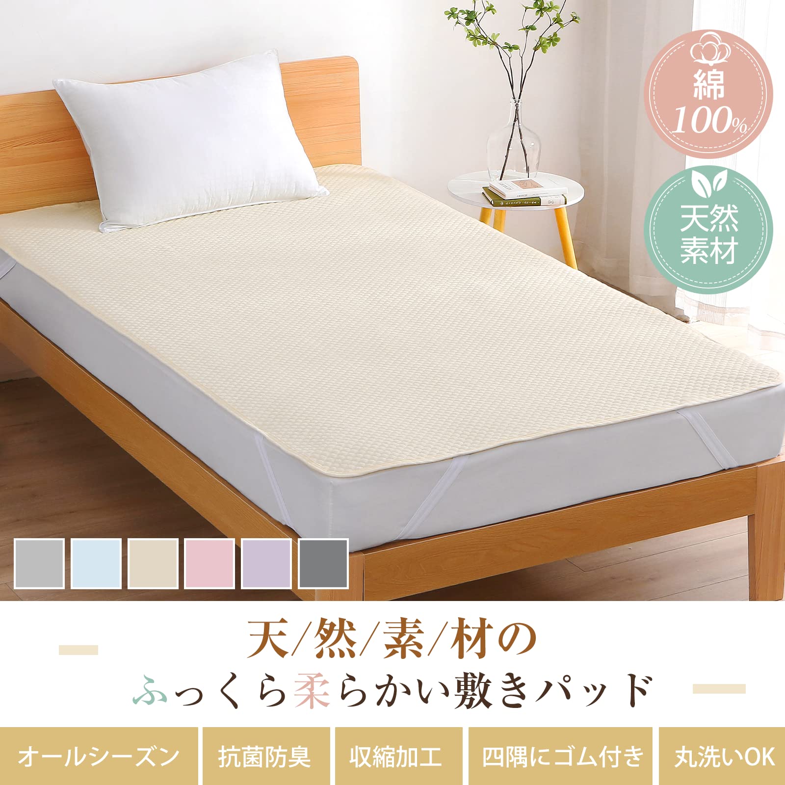 【綿100%パイル生地・オールシーズン使え】お肌に触れるパイル部分には、天然素材の綿を100%使用します。吸水性のよい綿素材は速乾性に優れているため、寝汗をしっかり吸収・発散してくれるので、汗ばむ季節はさらっと快適、寒い季節はほんのりあったかで、寝心地良く、毎日サラリと快適に眠れます。季節を問わず、オールシーズン活躍してくれる敷きパッドです。