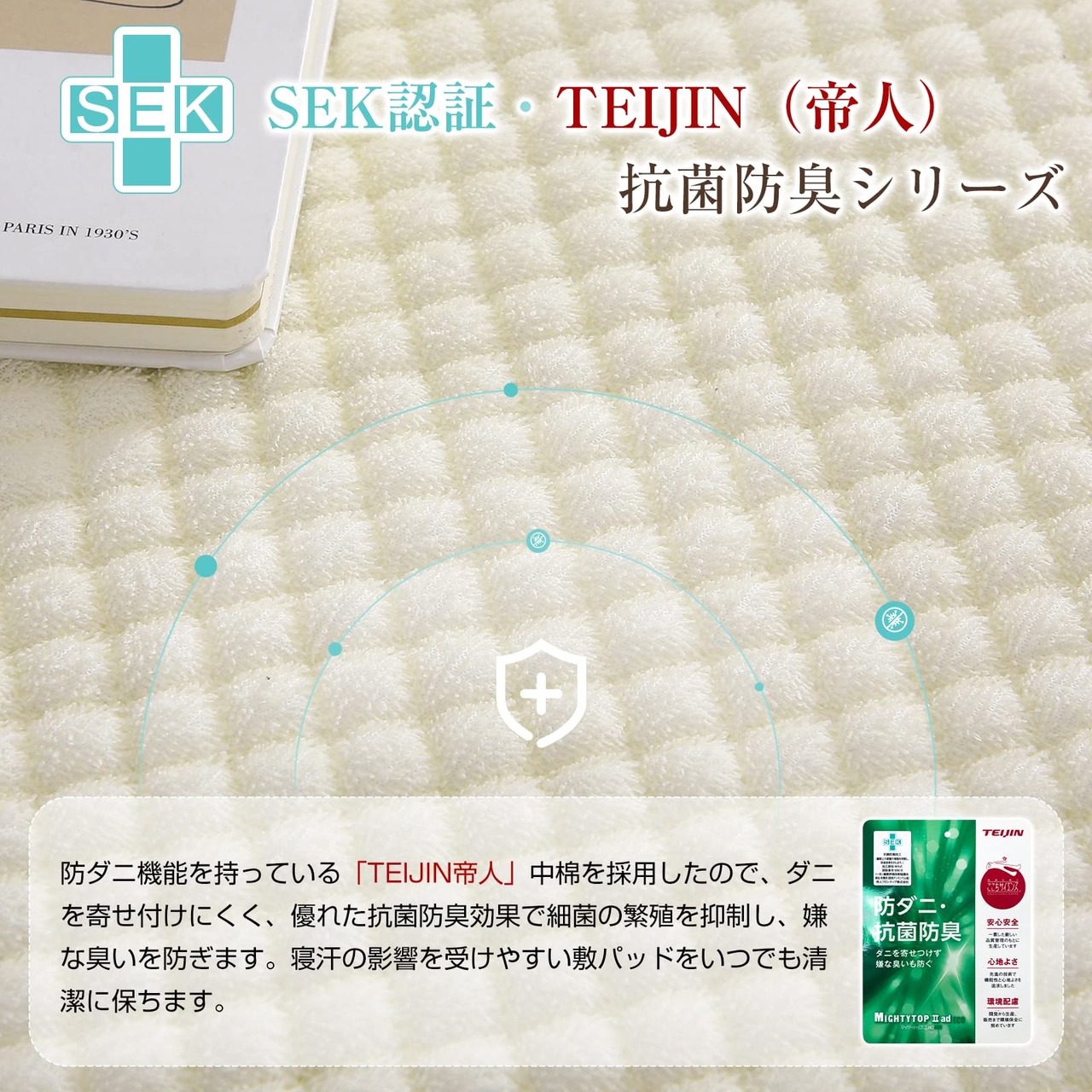 【SEK認証・TEIJIN(帝人)抗菌防臭シリーズ】中綿そのものがテイジンの機能繊維「マイティトップII ECO」を使用し、ダニを寄せ付けにくく、細菌の増殖を抑制し防臭効果も発揮して、寝汗の影響を受けやすい敷パッドをいつでも清潔に保ちます。SEK認証された優れた抗菌防臭効果で、敏感なアレルギー体質の方や小さなお子様にも安心でお使い頂けます。
