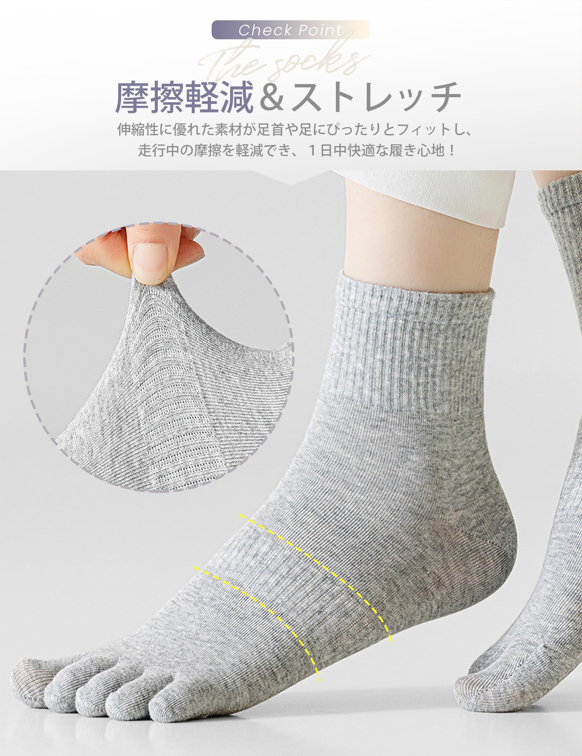 【さっと吸湿速乾・抗菌防臭】五本指ソックスは80%―90%コットン素材を採用しており、通気性抜群!足からかいた汗が冷える前に、素早く吸収・発散し、ニオイや水虫の原因となる雑菌の繁殖を抑えることができます。普通のレディース靴下だと一日中指が閉じたままで、指間が汗ばみやすい。しかし、5本指ソックスなら指がセパレートされ、通気性・放湿性に優れます。蒸れないくるぶし靴下は、ランニング、ウォーキングなどのスポーツで大活躍!