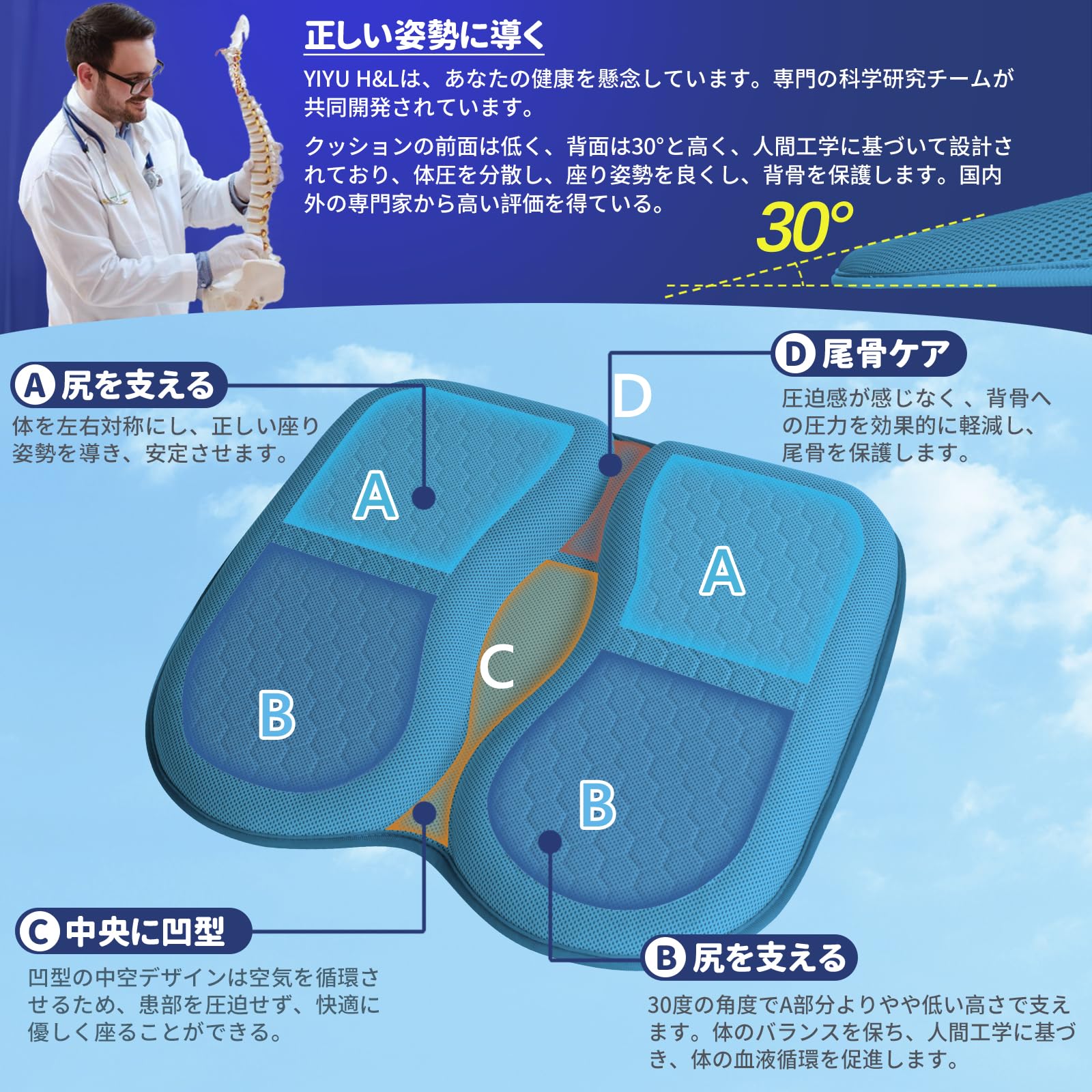【人間工学設計、姿勢を良くして、健康になれる】両ももにフィットするアーチ型設計;坐骨結節に集中する身体の圧力を分散し負担を軽減する。U字スリットで患部や尾骨の接触や圧迫を防ぐ。お尻の曲線に合わせた形状なので安定した姿勢を保ちやすく、痛みの発生しやすい箇所の圧力を軽減できる。