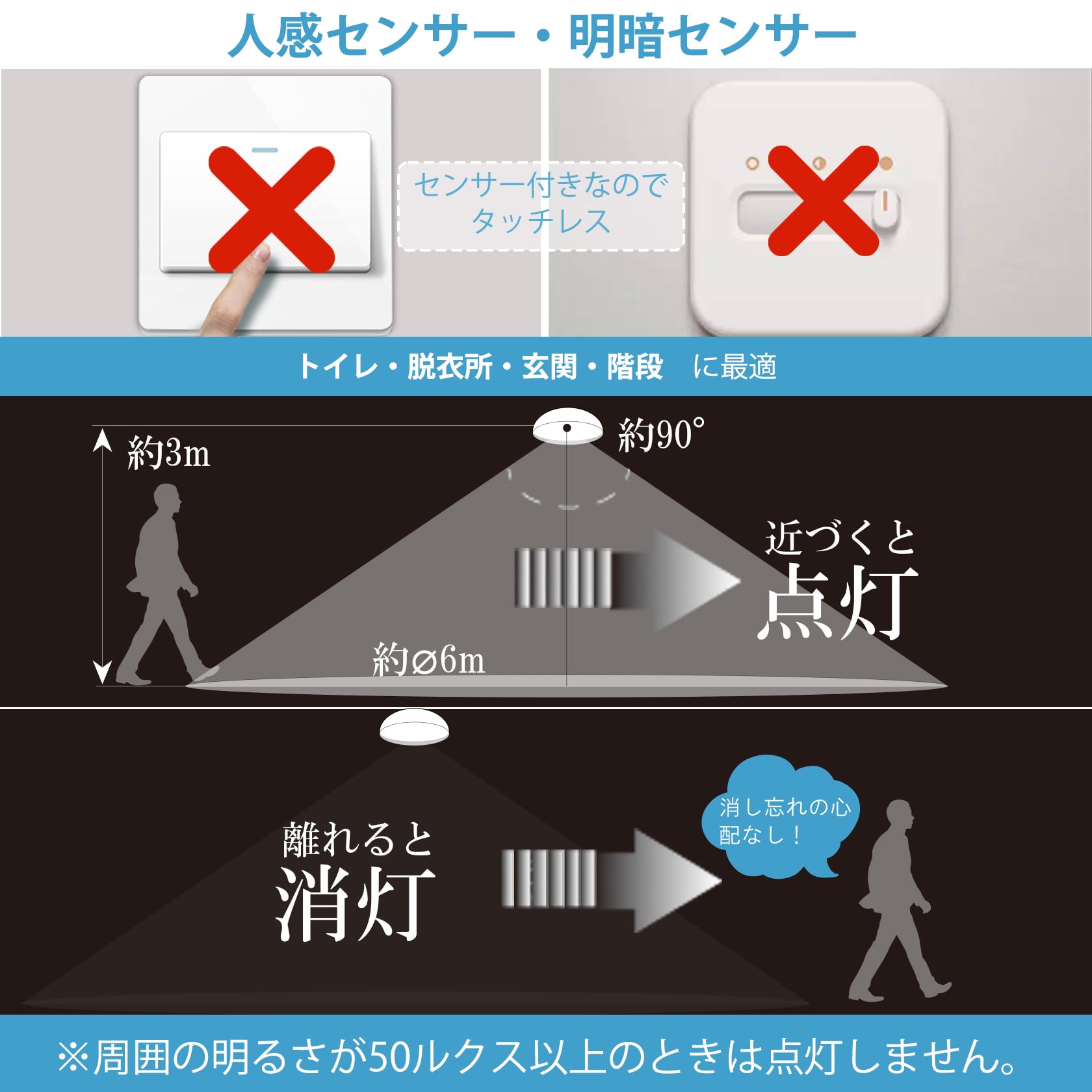 【商品仕様】◉品名: 人感センサー付き LED小型シーリングライト ◉商品サイズ:直径約15㎝×高さ約5.5cm(端子含め) 本体重量: 0.15kg ◉定格電圧:AC100V(50/60Hz) 定格消費電力:12.0W ◉器具光束:1350lm 配光角:約160°◉演色性:80Ra ◉設計寿命:50000時間 ◉点灯時間:約30秒(離れるとき) ◉感知範囲:直径6m
