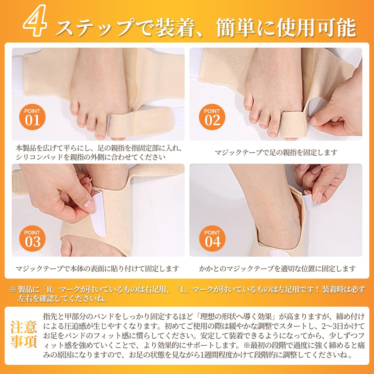 【ご注意事項】指先と甲部分のバンドをしっかり固定するほど「理想の形状へ導く効果」が高まりますが、締め付けによる圧迫感が生じやすくなります。初めてご使用の際は緩やかな調整でスタートし、2~3日かけてお足をバンドのフィット感に慣らしてください。安定して装着できるようになってから、少しずつフィット感を強めていくことで、より効果的にサポートします。※最初の段階で過度に強く締めると痛みの原因になりますので、お足の状態を見ながら1週間程度かけて段階的に調整してくださいね。