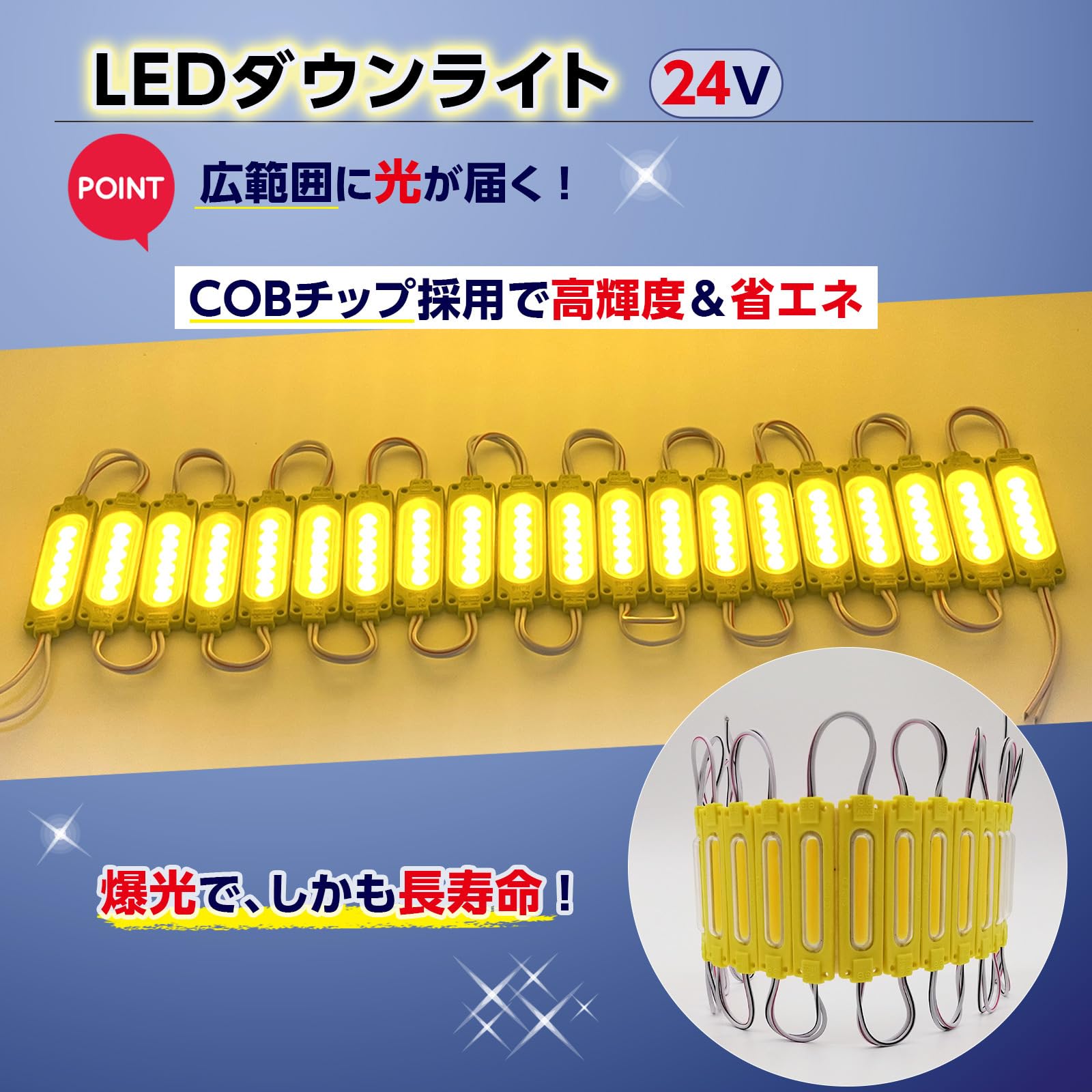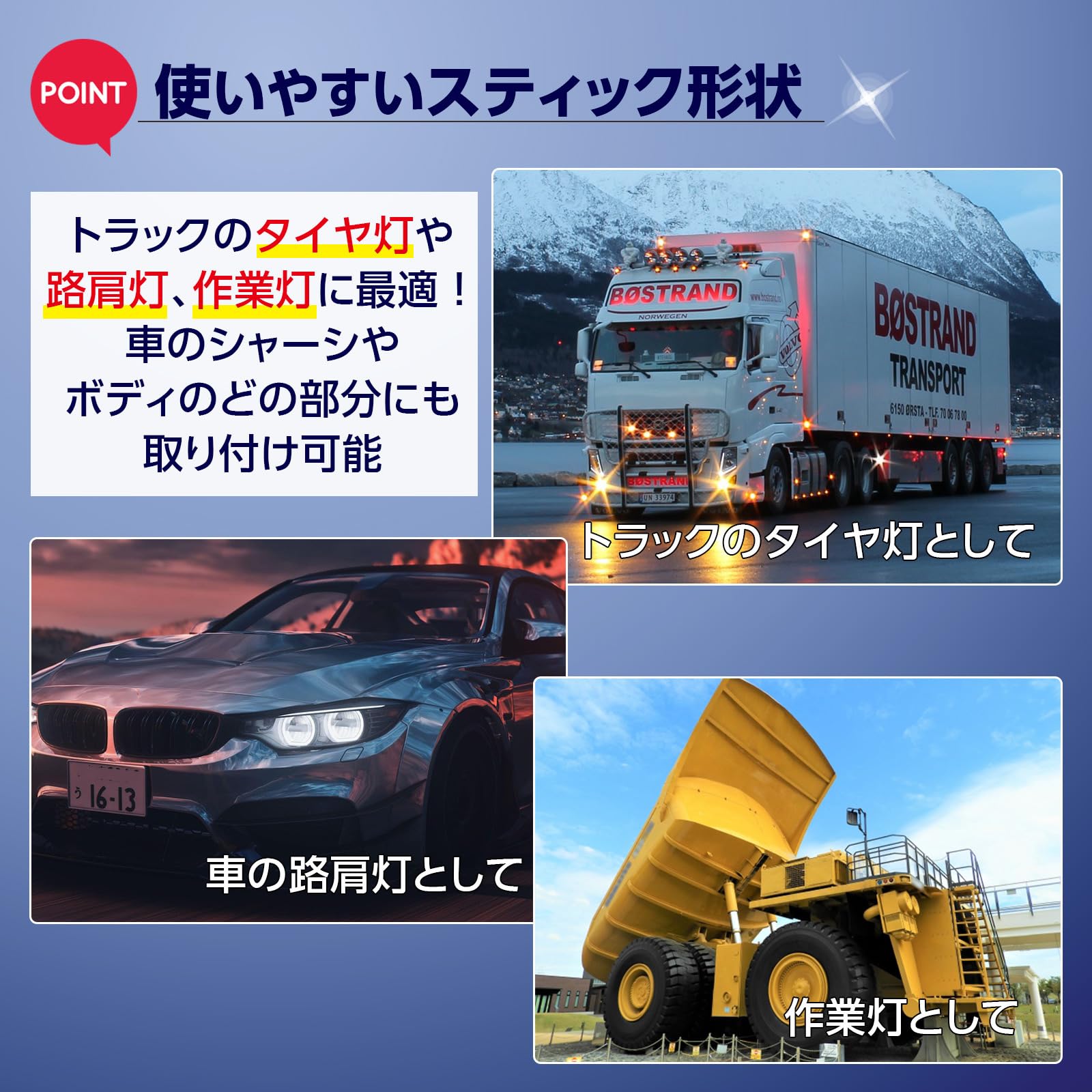 【概要】24V専用のLEDダウンライト。COBチップ採用で高輝度&省エネ。スティック型で、トラックのタイヤ灯や路肩灯、作業灯に最適。防水仕様で雨天時も安心。 カット可能な発光部で、お好みのサイズに調整OK!カラーバリエーションも5種類あり、お得な20個セット。
