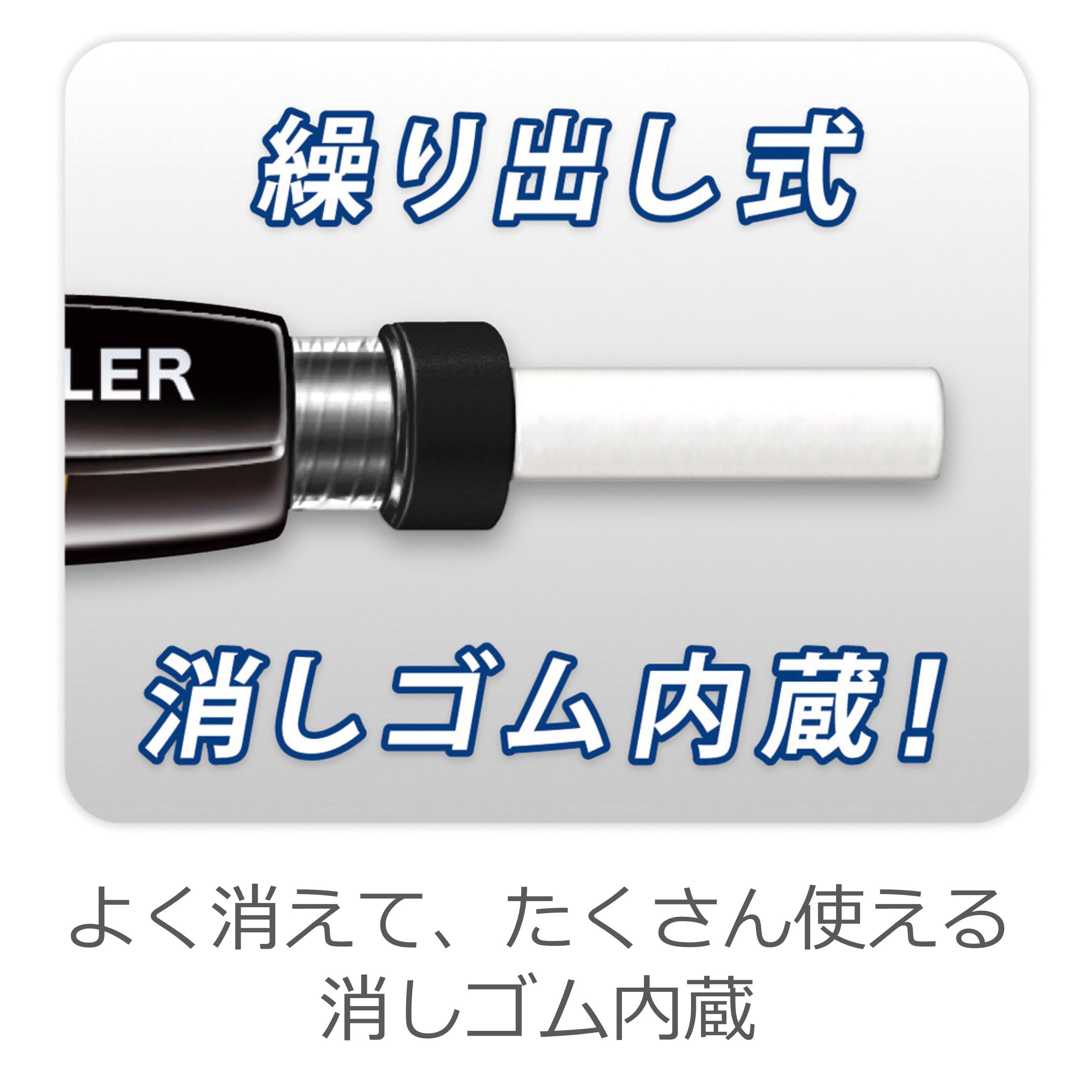 文字を消す際にも役立つ、長い消しゴムを内蔵(交換用消しゴムもあります)。