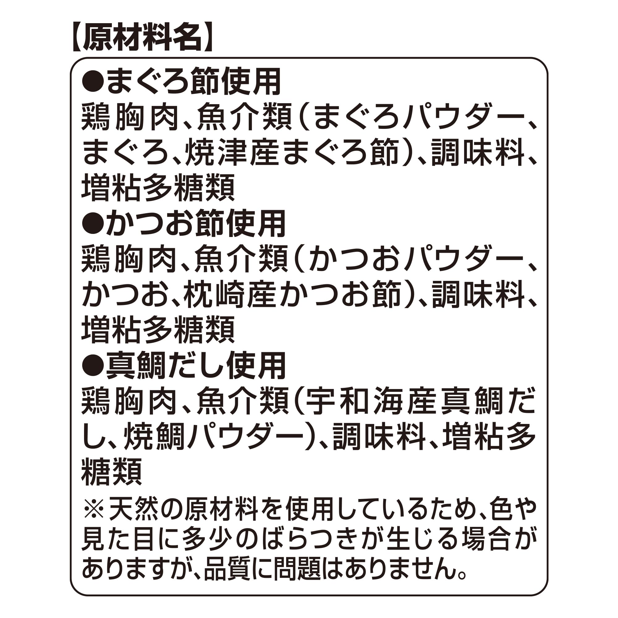 【原材料(成分)】 【まぐろ節使用】 鶏胸肉、魚介類(まぐろパウダー、まぐろ、焼津産まぐろ節)、調味料、増粘多糖類 【かつお節使用】 鶏胸肉、魚介類(かつおパウダー、かつお、枕崎産かつお節)、調味料、増粘多糖類 【真鯛だし使用】 鶏胸肉、魚介類(宇和海産真鯛だし、焼鯛パウダー)、調味料、増粘多糖類 【保証成分】 【3種共通】 タンパク質6.0%以上、脂質0.5%以上、粗繊維1.0%以下、粗灰分3.0%以下、水分95.0%以下 【エネルギー】 【3種共通】 約3kcal/1本