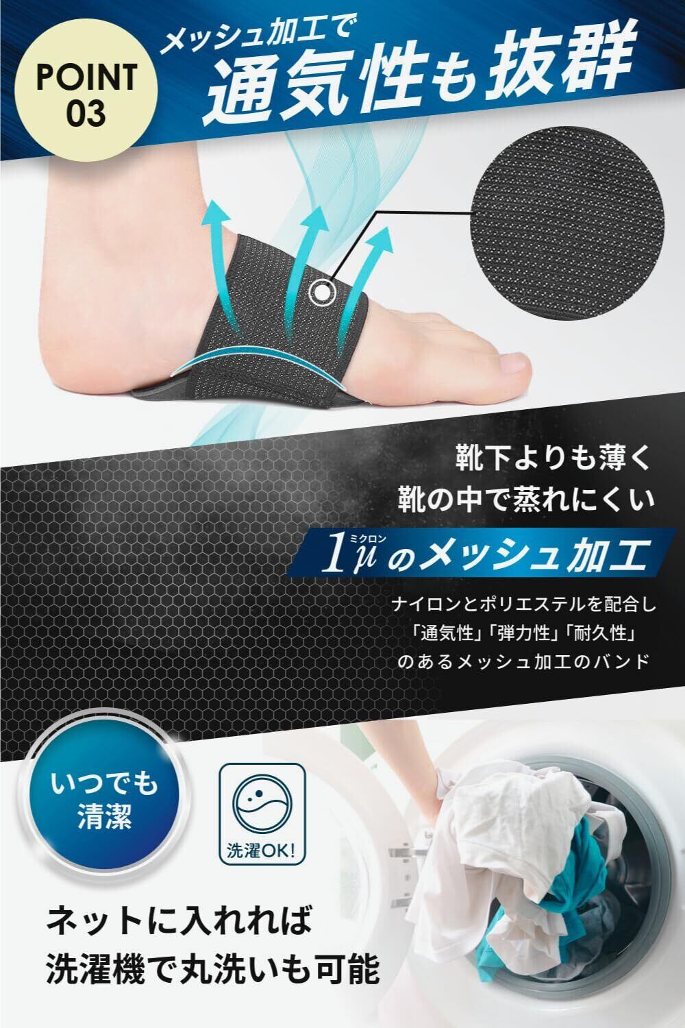 【様々な用途に適用】つま先から通す簡単着用です。スポーツ、立ち仕事、フィットネスなど様々な場面で活躍。丸洗い可能なため清潔に使用できます。 【開院10年の市原整骨院導入モデル】現在日本人の約7割が扁平気味(アーチのない又は低い)足と言われておりお客様の悩み向き合い院長監修のもと 優しく土踏まずを押し上げる優れたEVA素材のクッションでアーチを作り地面を掴む感覚を養うよう設計しました。 【 2~3㎝の理想的な高さので地面を掴む】現役接骨院院長監修のもと100人以上のお客様の声を元に改良設計いたしました。 2~3㎝の理想的な高さので着用時に足裏の筋肉が刺激され軽く指が曲がり地面をつかんでる感覚があります。 【軽量かつ衝撃吸収素材】スポーツウェア、水着にも使われるナイロン使用のバンド、スポーツシューズやサンダルの靴底、ヨガマットなどにも多く使われてるEVA素材使用のクッションの為、軽量かつ衝撃吸収に優れたサポーターです。 【マスクレベルの通気性】「靴下よりも薄く」「靴の中でも蒸れにくい」1μのメッシュ加工。靴下の上からや素足での着用、靴の中でも蒸れにくい厳選素材、設計となっております。