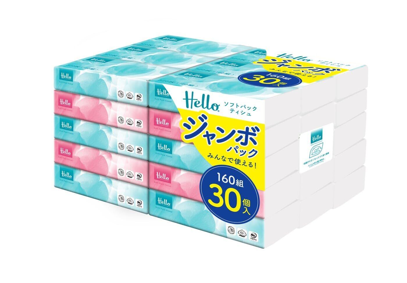 【やさしい肌触りで安心のティッシュ!】ユニバーサル・ペーパー ハロー ソフトパックティッシュは、160組入りが30個入ったお得なケース販売です。やわらかい質感で、肌に優しく日常使いに最適です。特に敏感肌の方にもおすすめで、ご家族みんなが安心してお使いできます。