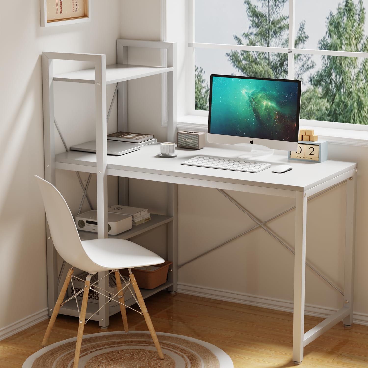 【ラック一体型デスク】ラック一体型デスクの実用性は、ラックとデスクトップがシームレスに一体化した設計にあります。別途ラックを設置する必要がないため、小さな住居など限られた空間を節約でき、物品が手元に届きやすくなり、作業効率を大幅に向上させることができます。