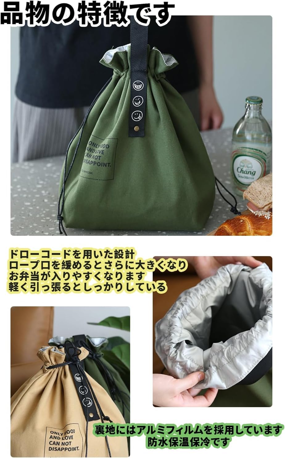 【新着商品】保冷 保温 綿100%のキャンバス生地 ランチバッグ-内側断熱アルミウール綿 大容量/便利/シンプル/ファッション/無地で でシンプルな 巾着バッグ-耐久性 防水 アウトドアキャンプピクニックバッグなどに 男女兼用 お弁当袋 (グリーン) | asaRulu0511