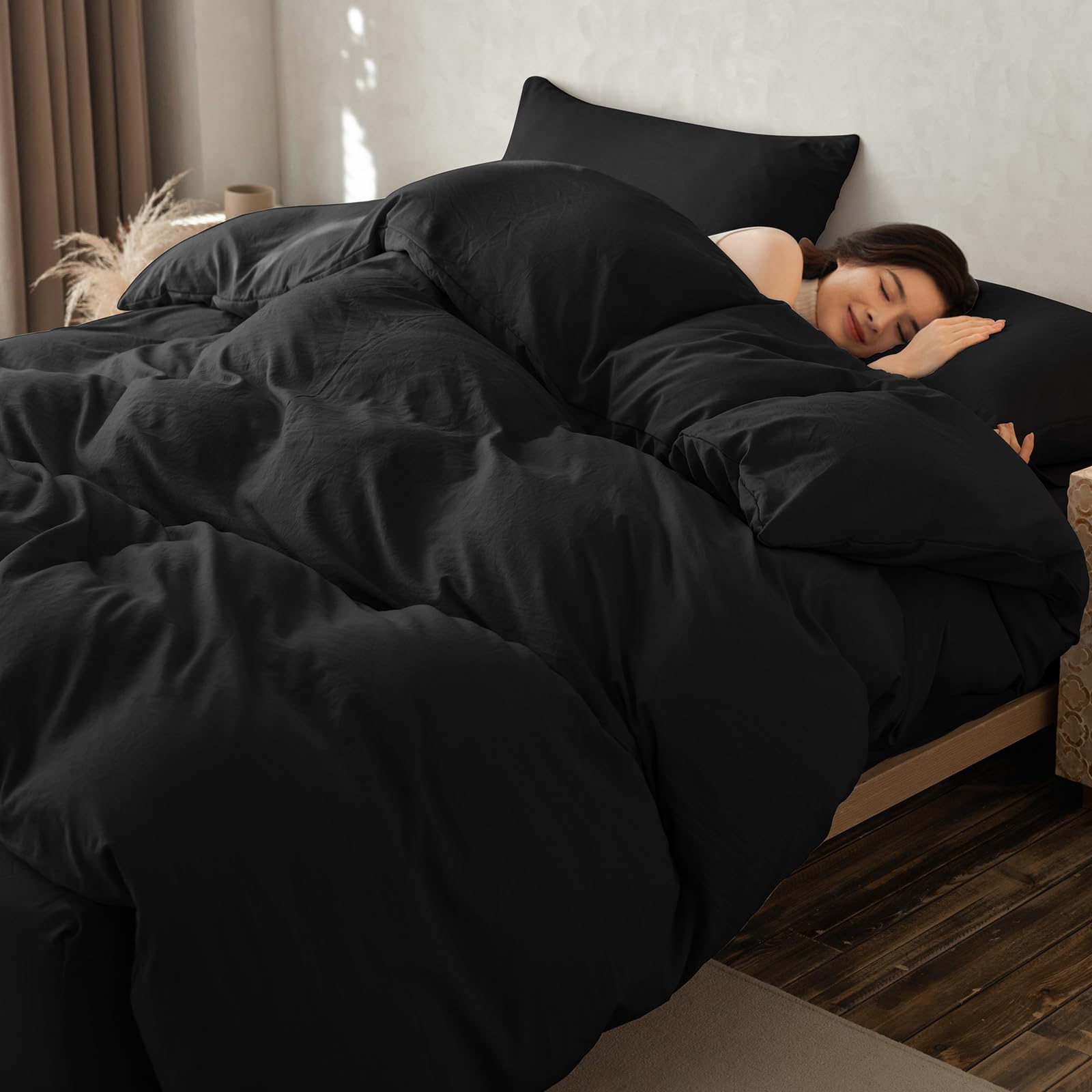 Lemon Bear 掛け布団カバー シングル【CICA柔軟加工・洗いざらし】 布団カバー シングル 超吸水速乾 洗える かけ布団カバー オールシーズン 抗菌防臭 布団かはー スナップボタン8箇所 着脱簡単 肌に優しい 布団かばー 通気性(150x210cm ブラック)