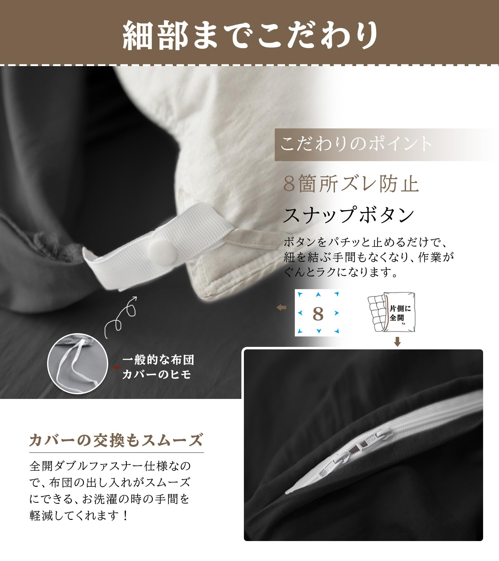 【気楽な"便利"がいっぱい!かけ布団カバー シングル】布団留めにはスナップボタンを採用し、パチッと留めるだけなので、つけ替えにかかる時間が一気に短縮します。8箇所のスナップボタンが付きますので、しっかり固定できます。ボタンをパチっと止めるだけで、紐を結ぶ手間もなくなり、着脱がぐんとラクになります。ダブルファスナー仕様なので、左右どちらからでも開閉できます。出し入れがスムーズにできる全開ファスナータイプはお洗濯の時の手間を減らせます! 【耐久性を強化・掛け布団カバーシングル】高品質の素材と丁寧な縫製が施されており、長期間の使用にも耐える頑丈な仕上がりです。毎日の使用や洗濯にも十分耐えられるので、長く愛用できる点が特筆されます。