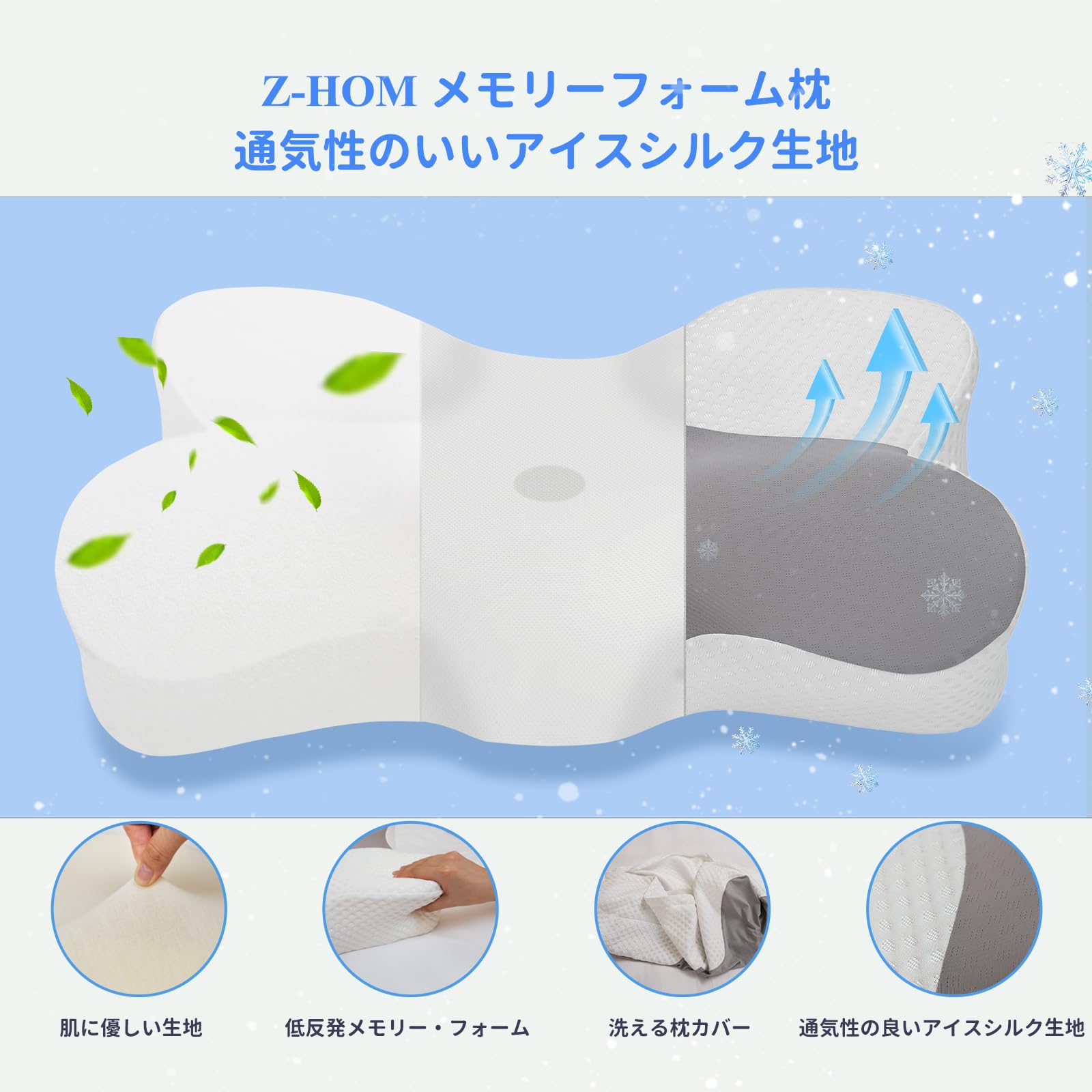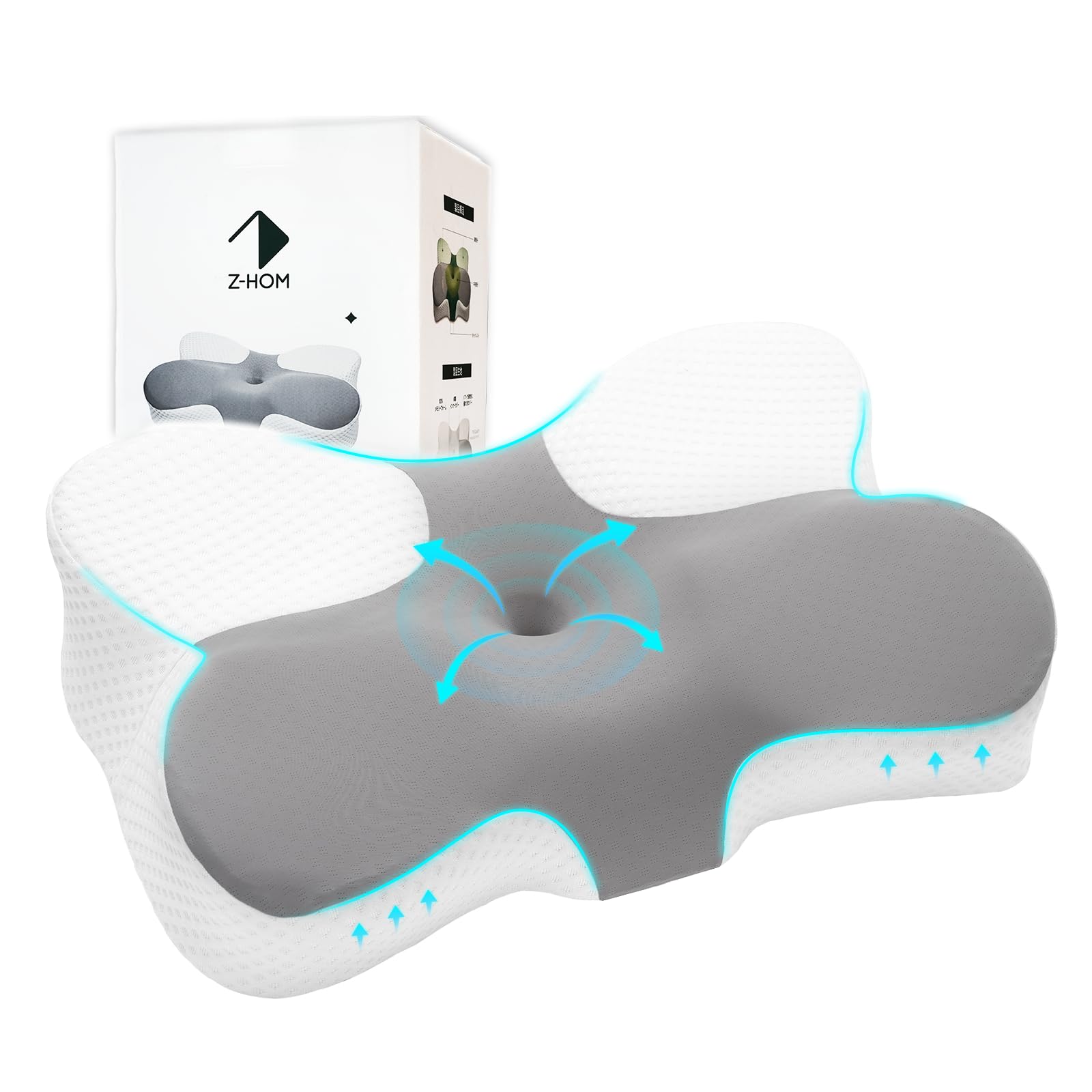 「1. 首や肩の負担を軽減する設計」Z-HOM蝶形デザイン枕は首や肩の負担を軽減するために設計されています。人間工学に基づいた中空設計や高さ調整機能があり、個々のニーズに合わせて最適なサポートを提供します。